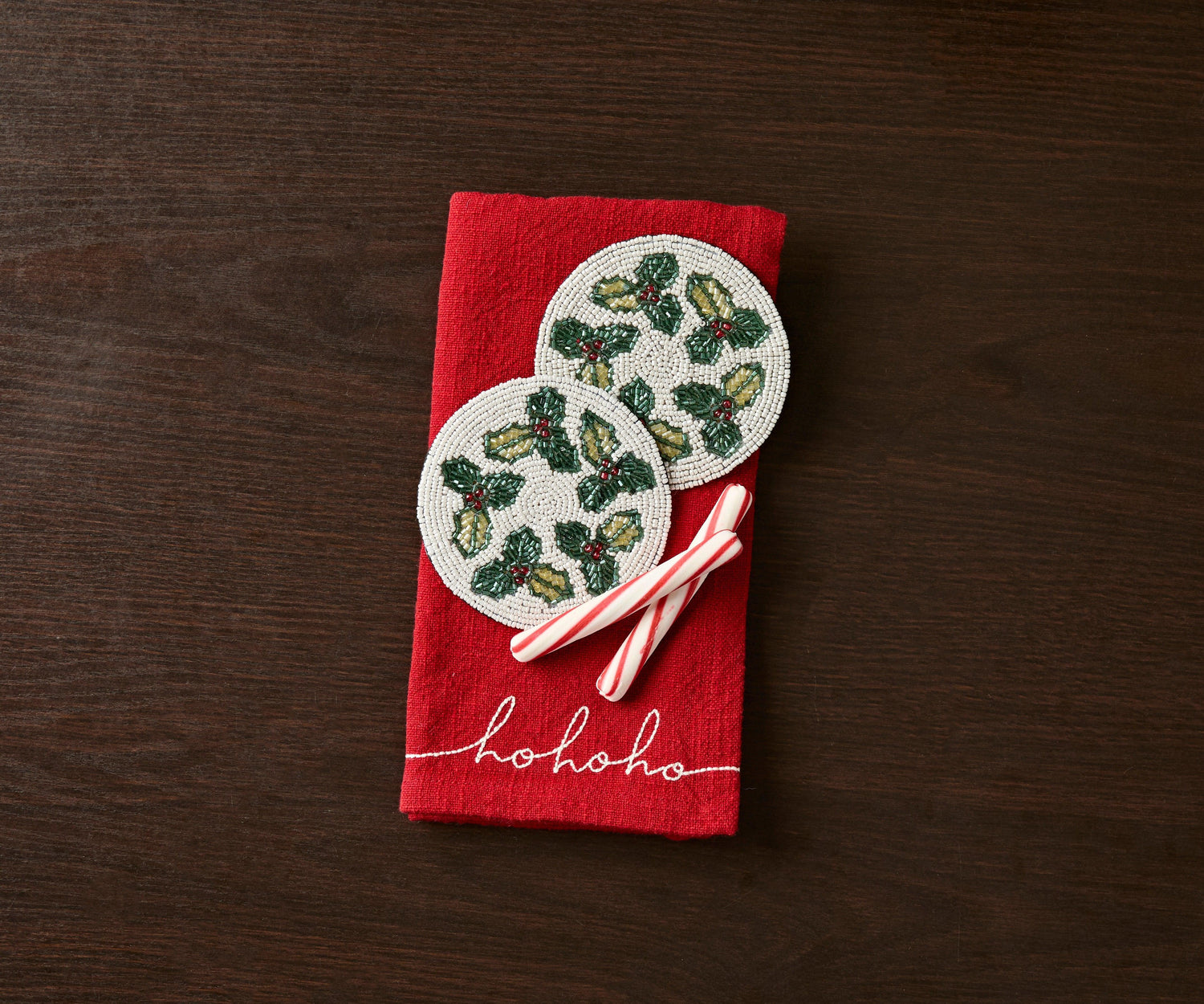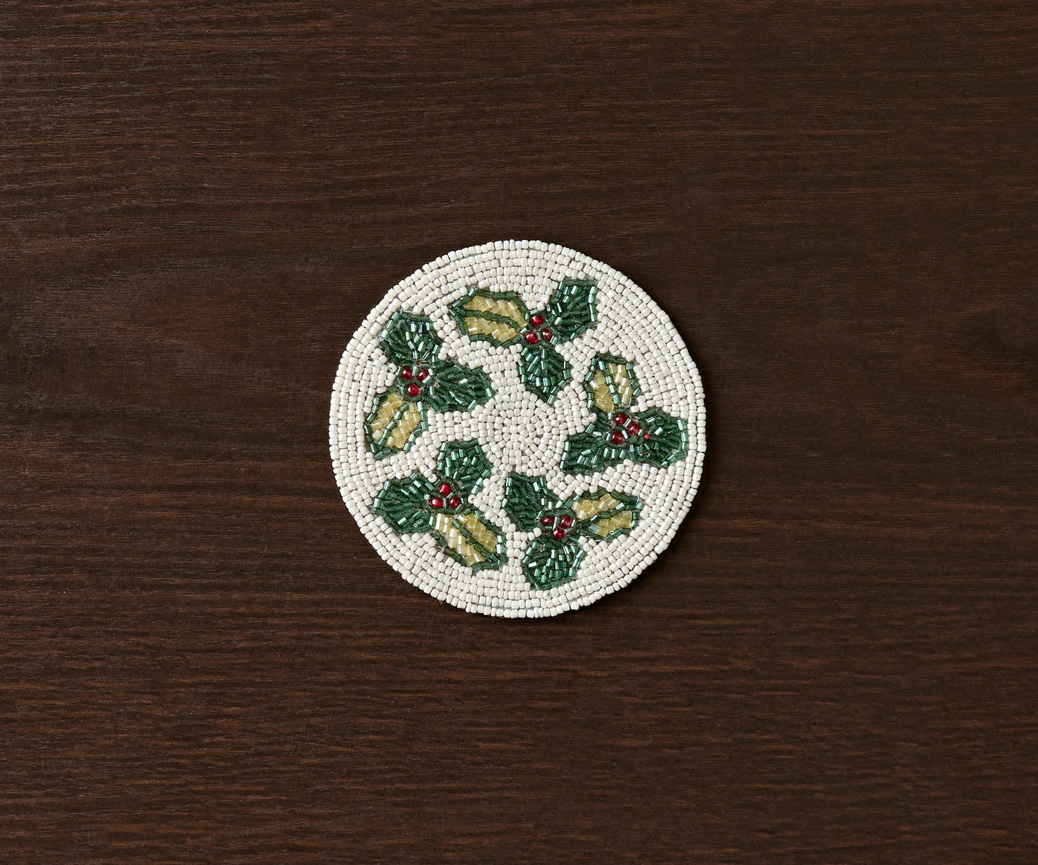 Hand-sewn Embroidery Seed Beaded Coasters | Red Berry Foliage Christmas Design | Payton James Holiday Table Decor