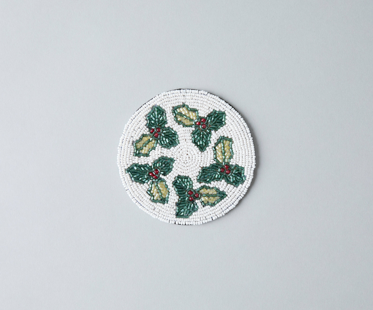 These adorable beaded coasters will add a little holiday brightness to your table. These coasters have a lovely holly leaf design and are handcrafted with exquisite glass beads and a black velvet backdrop.