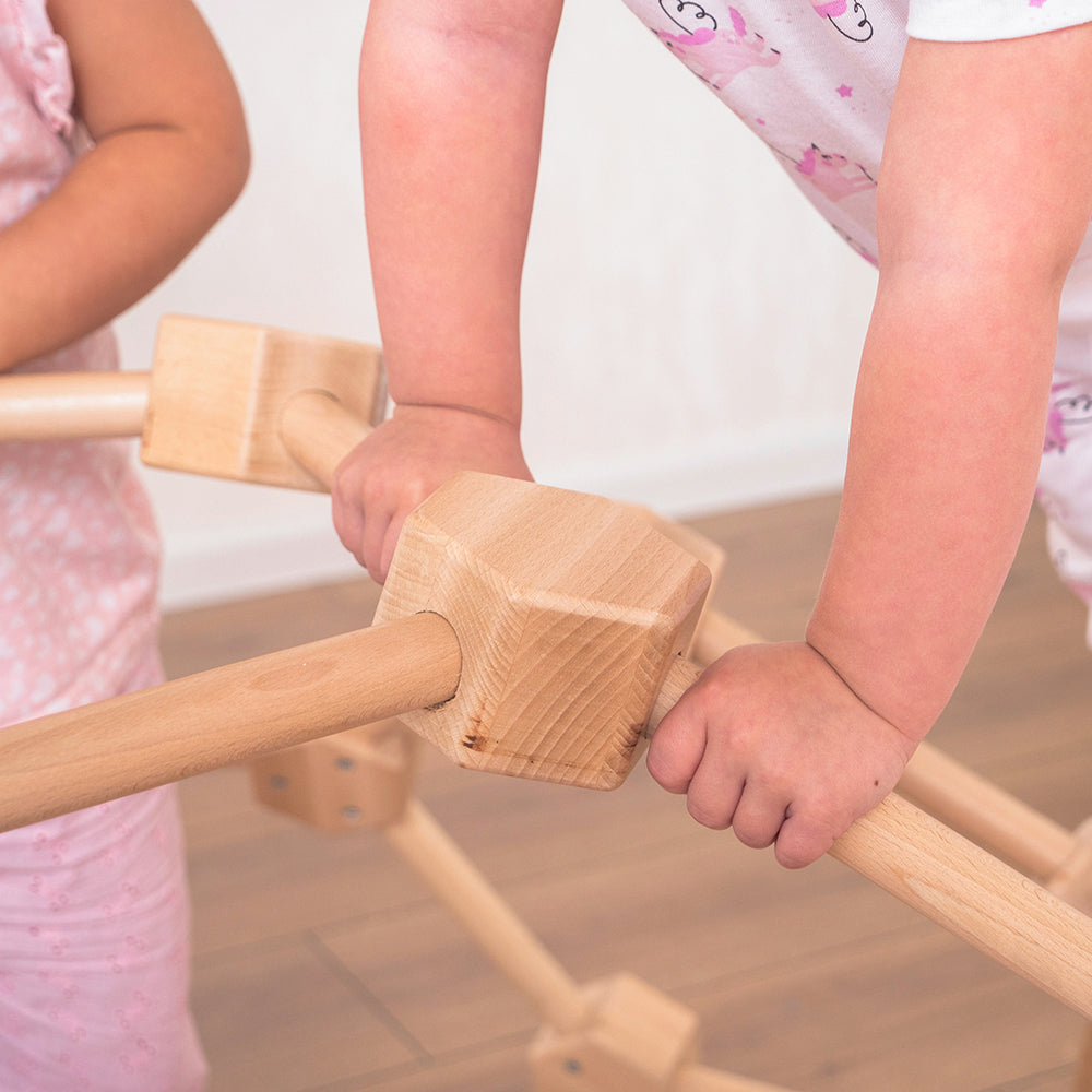 The Wooden Climbing Dome is a home jungle gym for toddlers designed for endless fun, which, besides bringing good vibes, benefits the overall development of a child's physical and cognitive abilities. The indoor children's playground is suitable for children from 1 to 6 years old. Kids can crawl on top, swing on the bars, navigate between the sectors of this climber dome-like in a labyrinth, play "The Floor is Lava," and come up with countless other activities limited only by their imagination.