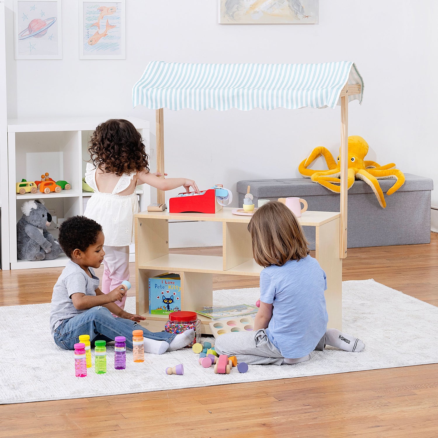- Spacious tiered shelving for organizing play food, toys, or educational materials