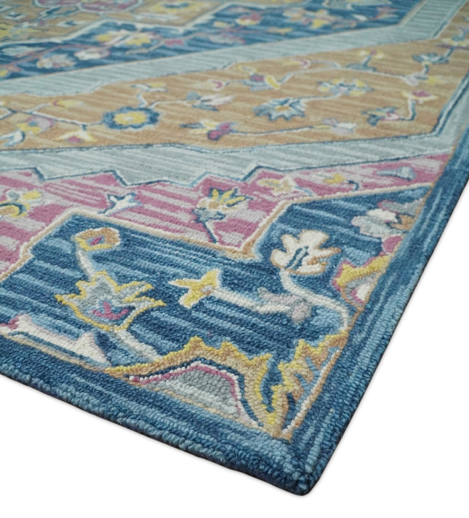 This hand-tufted area rug is crafted from fine wool and features a Heriz-inspired medallion design in blue and pink, blended with multiple colors for a modern and elegant look. The loop weaving adds a textural element to interiors.