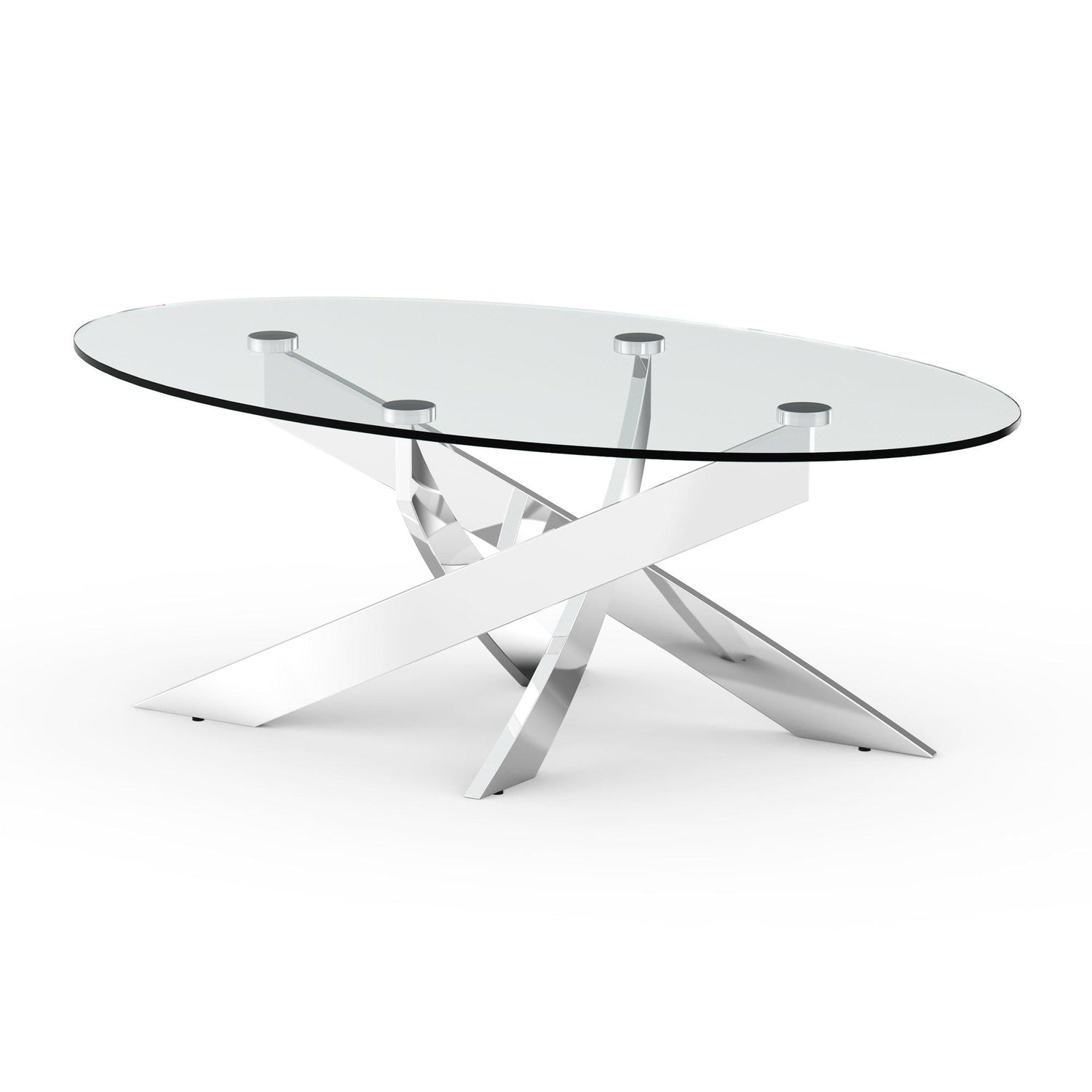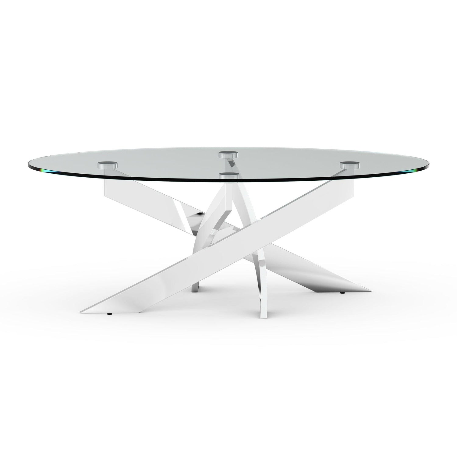 Modernize your living room with this table front and center. Chrome leg panels cross beneath the spacious table before splitting and rising up to the glass tops in sleek and distinctive contemporary design.