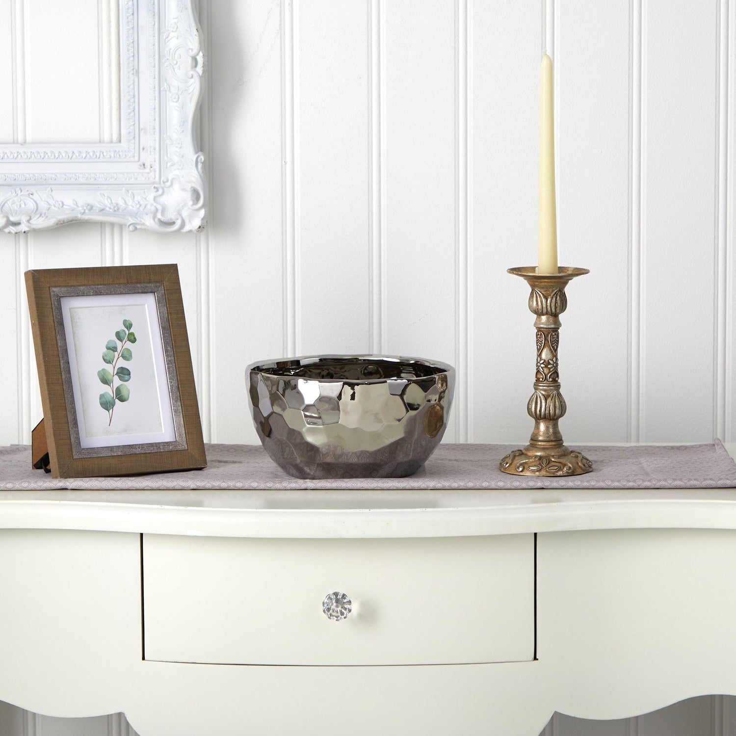 Add some glam to your space with this Designer Silver Bowl. If you want to bring attention to your greenery, look no further. Texture, color, and glare all in one. Perfect for Hollywood glam, modern, and many other décor styles. With a width 8.75", this bowl will attract attention wherever displayed. House hydrangeas, roses or other flowers.
