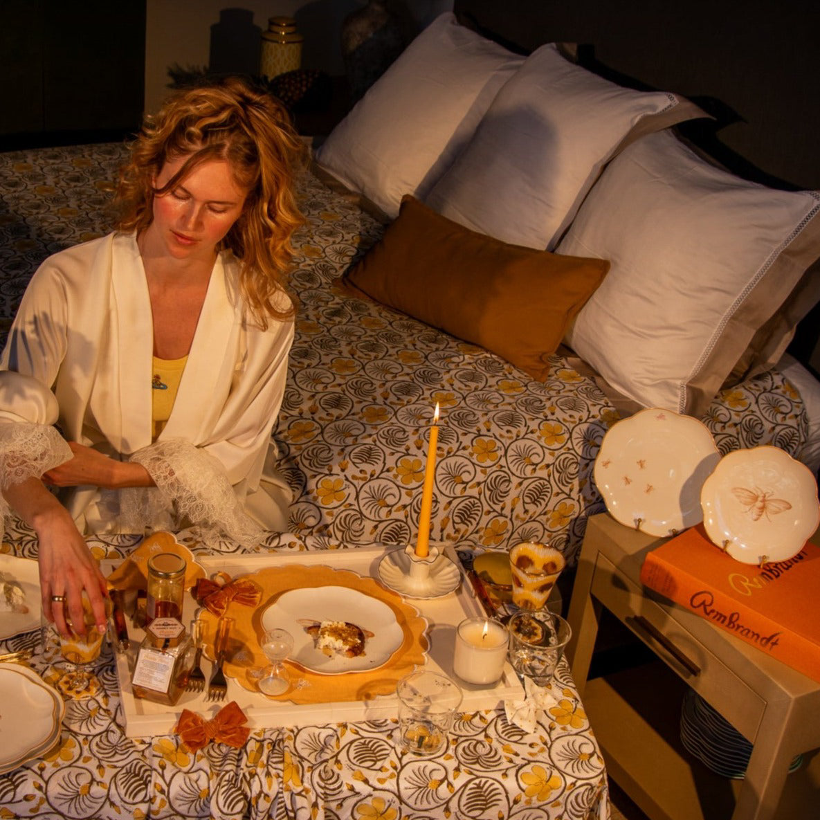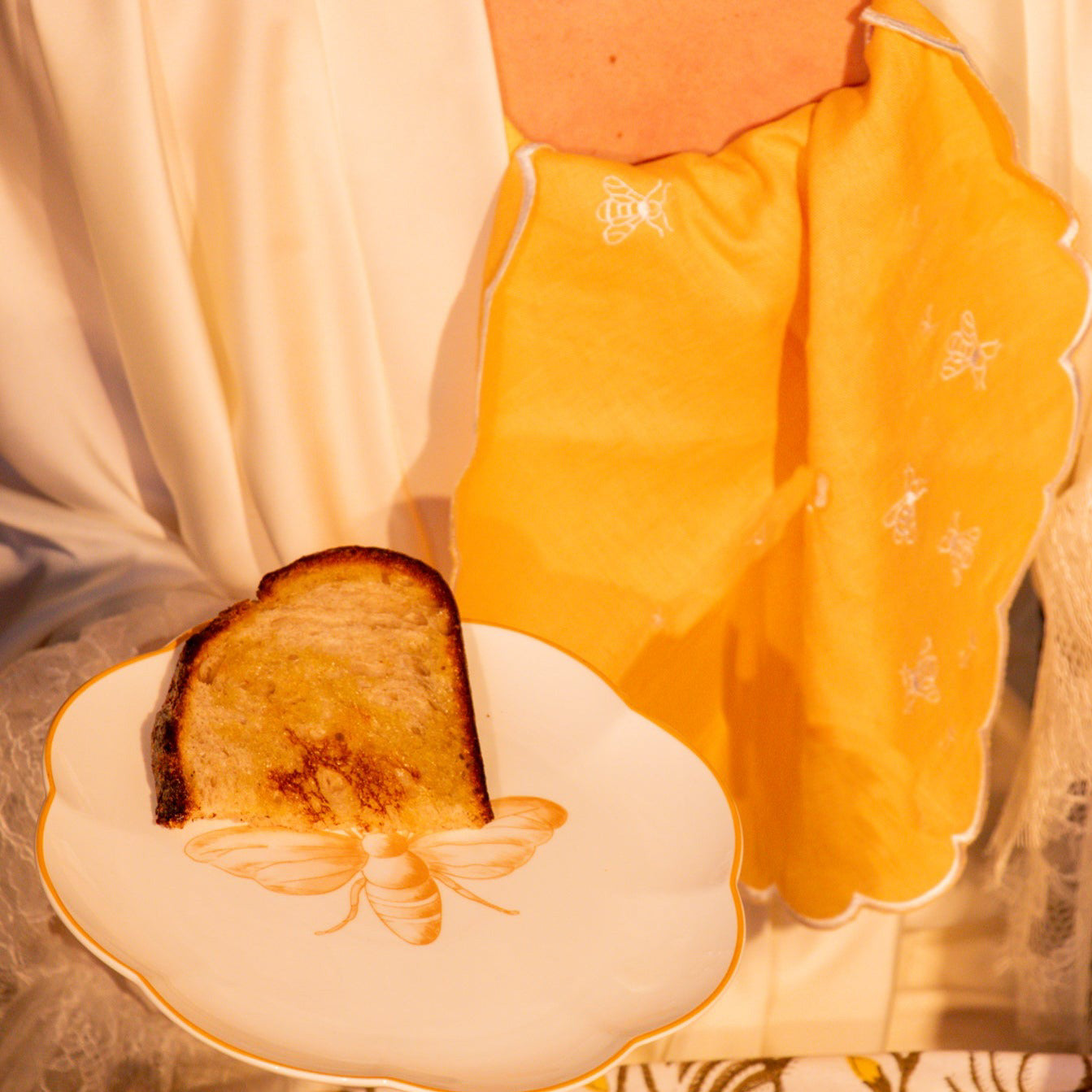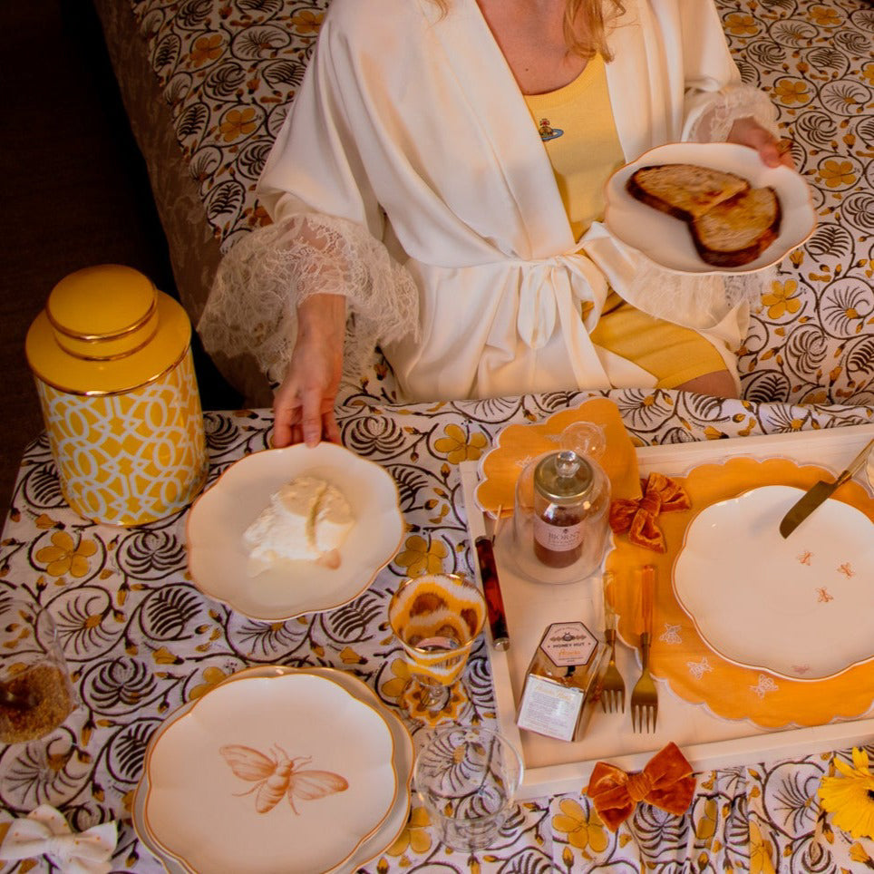 A solitary bumblebee, intricately sketched, claims a central place on a white scalloped plate. Whether it's a sunlit breakfast or a candlelit dinner, this plate - a prelude to the 'Bumble Voyage' dinner plate - brings a touch of summer's fleeting beauty and the tireless dance of the bumblebees.