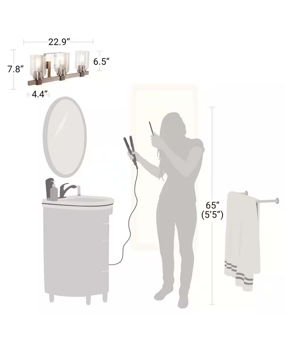 - FINISH - Modern farmhouse 3-light vanity features a 2-tone wood finish paired with brushed nickel hardware. 3 premium seeded clear glass shades beautifully showcase light and feature open shade bottom and exposed bulb to create bright light that illuminates surfaces, and the sink area below.
