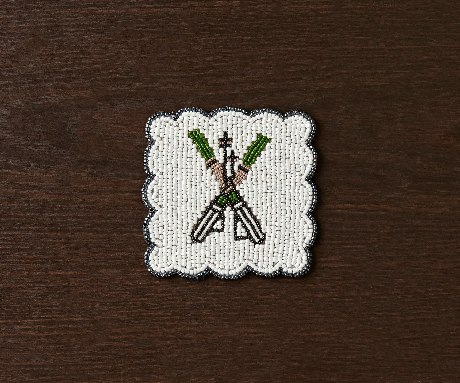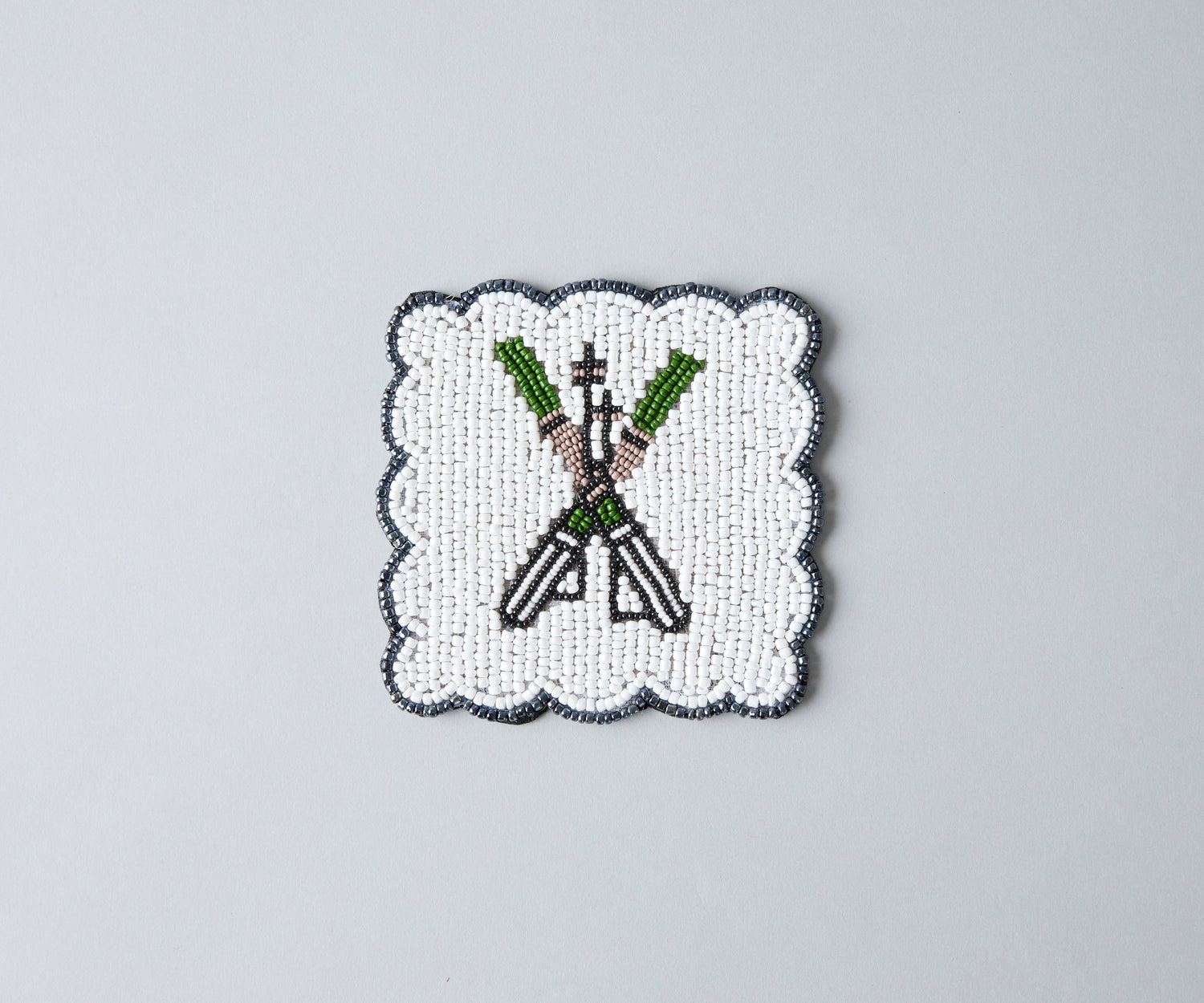 Handmade Beaded Ski Coaster with Pearls – Elegant Black, White, and Green Coaster for Tableware & Home Decor