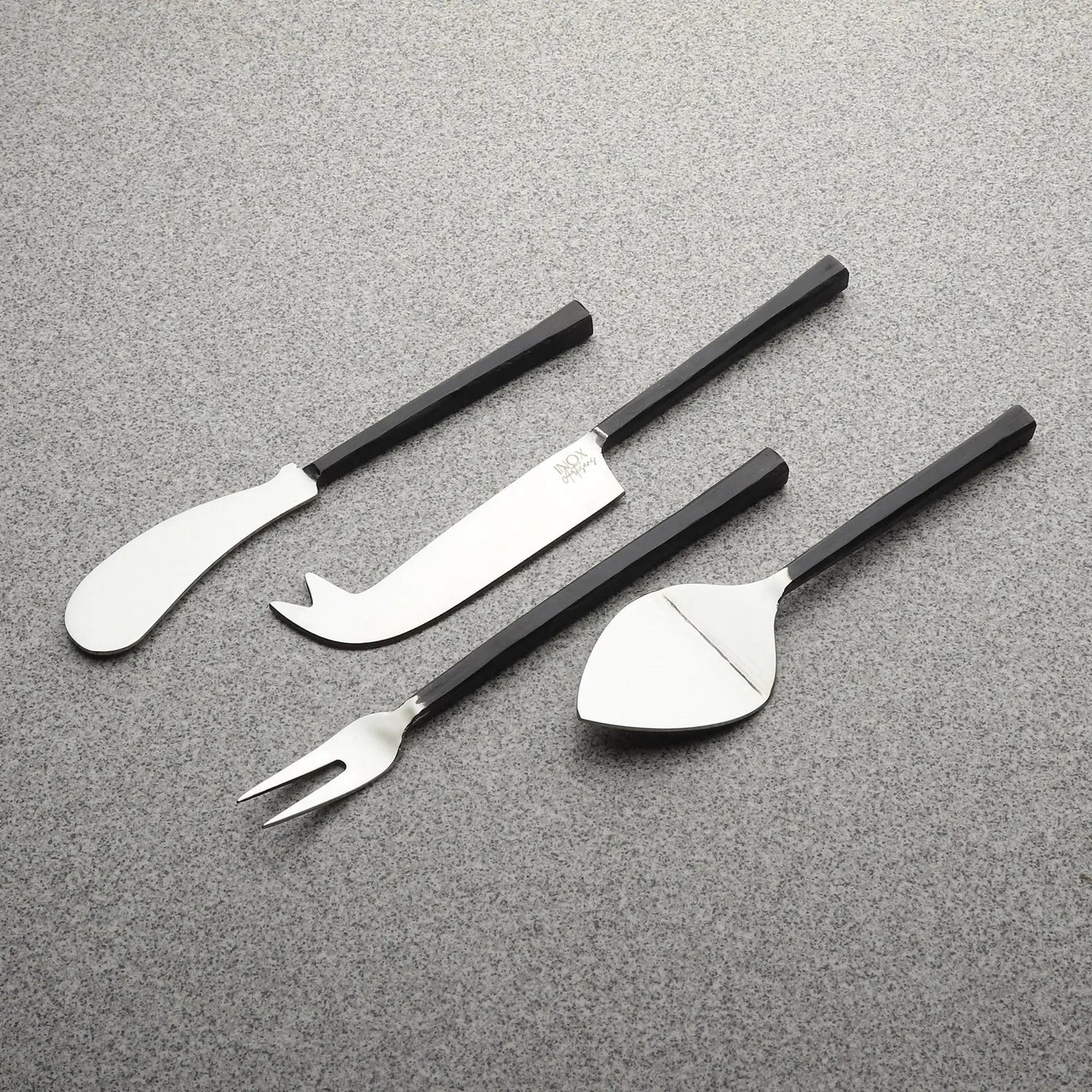 • Set includes: 1 pronged cheese knife, 1 cheese spreader, 1 two-prong fork and 1 cheese server