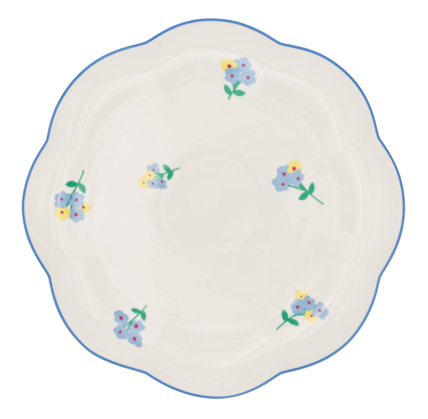 Sporadically sprinkled bouquets of periwinkle and sunflower-yellow blossoms, reminiscent of a meadow in full bloom, finished with a pastel blue scalloped rim, evoking hints of classic Italian and French ceramics. It's a modern nod to beloved European styles, perfect for the main course.