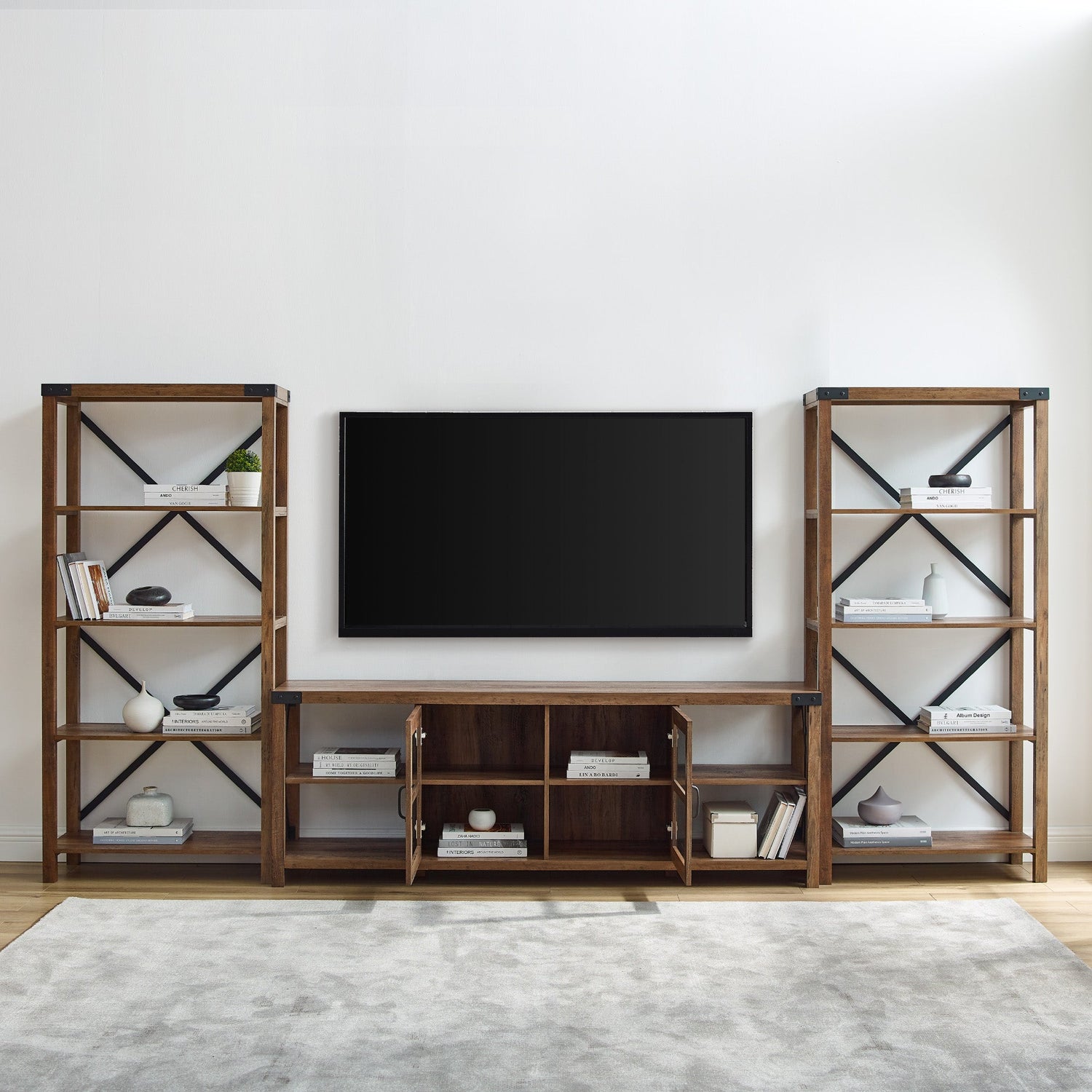 This Metal X Accent Wall with 70" Glass Door TV Console combines industrial-inspired design with practical storage solutions, crafted from warp-resistant MDF and durable laminate for lasting stability. The rustic metal X-back shelf details complement the smooth console top, which supports TVs up to 80 inches, while the tempered glass doors with soft-close hinges protect your media components and collectibles. Ideal for creating a cohesive entertainment space, this set includes two bookshelves and a TV stand, each offering ample open and concealed storage with built-in cord management for a clean setup.