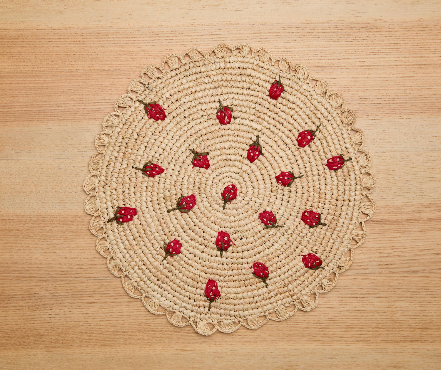 Scattered Strawberry Hand-Crocheted Raffia Palm Round Placemat