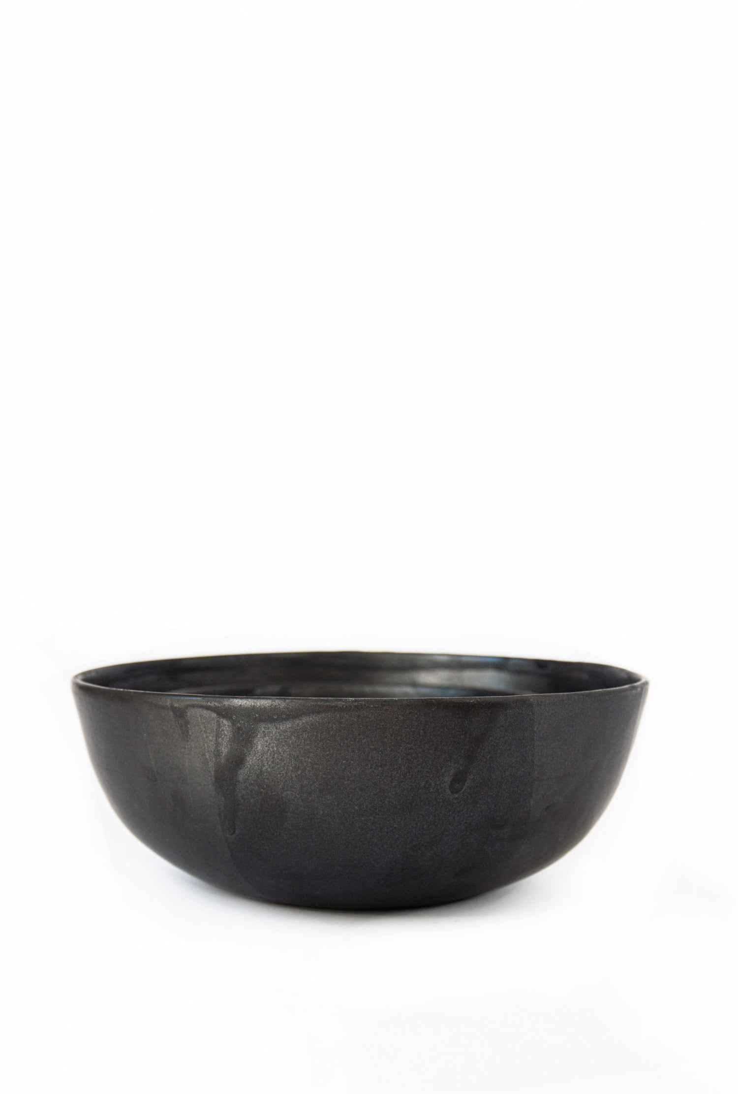 Matte black salad bowl brings pottery vibes to mealtime. Hand-dipped in a reactive glaze that swirls uniquely across each piece. Open form and simple style only add character to this dinnerware.