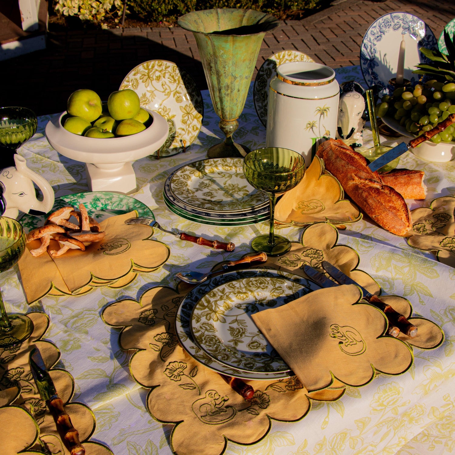 Step into the lush embrace of the Indian tropics with our Sunlit Moss Napkin from the Shimla Social Collection. Crafted from 100% yellow linen, adorned with a moss green embroidery of a playful monkey motif and a delicate scalloped trim. Pair it with our coordinating tableware from the Shimla Social collection