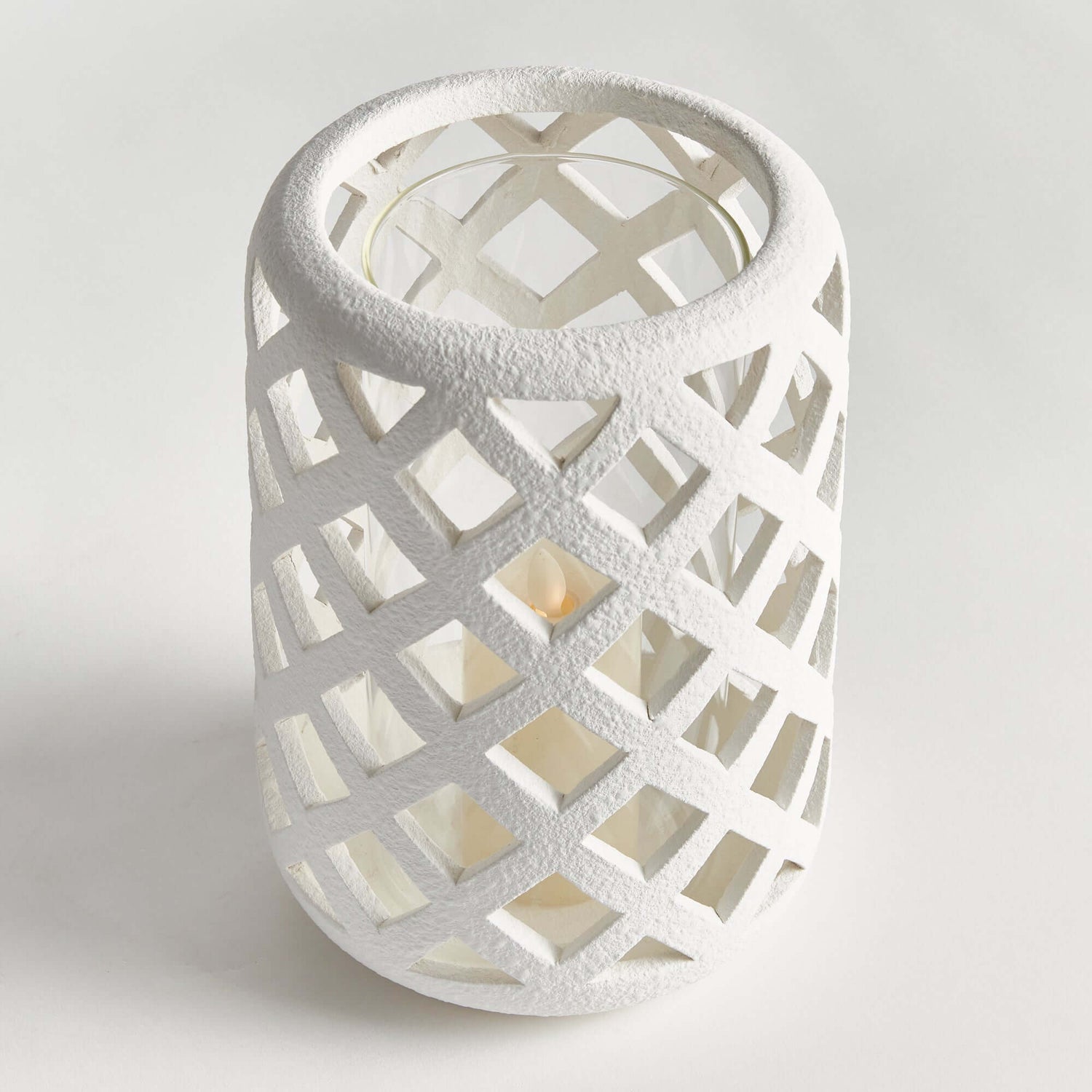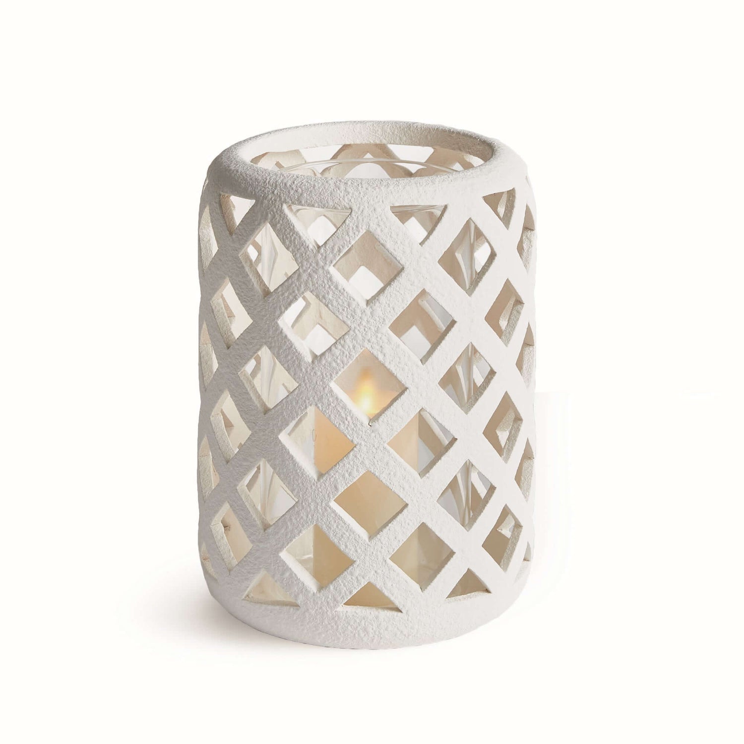 This terracotta hurricane candle holder with glass insert captures the quiet beauty of hand-crafted tradition and timeworn elegance. Formed from hand-cut ceramic strips and shaped into an airy lattice design, it casts soft, flickering shadows that echo the charm of vintage lanterns and garden courtyards. Nestled inside is a clear glass insert, designed to hold a tea light or small pillar candle — letting the glow shine gently through every opening.