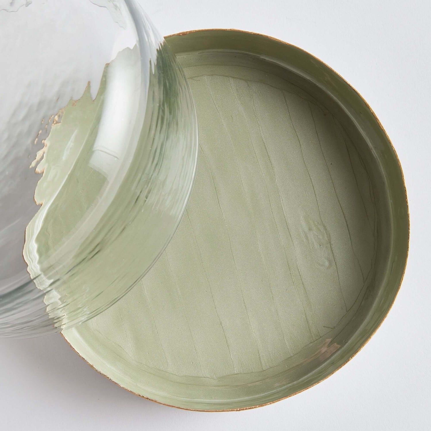 This vintage hammered glass cloche with green enamel tray is a romantic tribute to old-world kitchen elegance—where every detail carries history and every piece has a story. The cloche features hand-hammered glass, gently rippled like rain over windowpanes, offering a soft distortion that brings a dreamlike quality to whatever lies beneath. It rests atop an iron tray finished in a muted sage green enamel, its edge kissed with delicate gold foil that glows like sunlight on heirloom china.