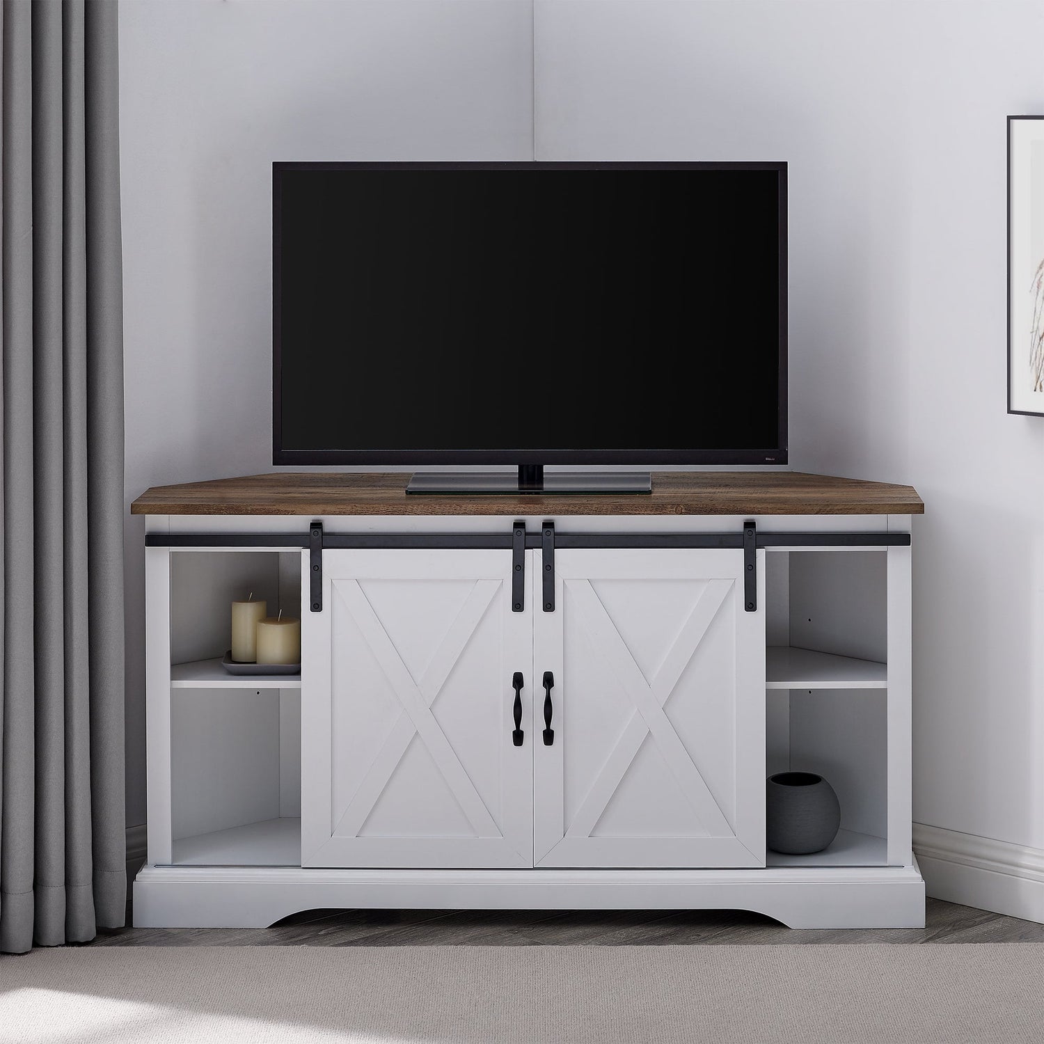 This 52" Sliding Barn Door Corner TV Stand combines modern farmhouse aesthetics with practical design, featuring rustic sliding barn doors on exposed powder-coated steel hardware. Crafted from warp-resistant MDF wood and durable laminate, it fits neatly into corner spaces, providing versatile storage with three adjustable shelves and cord management ports for a streamlined entertainment setup.