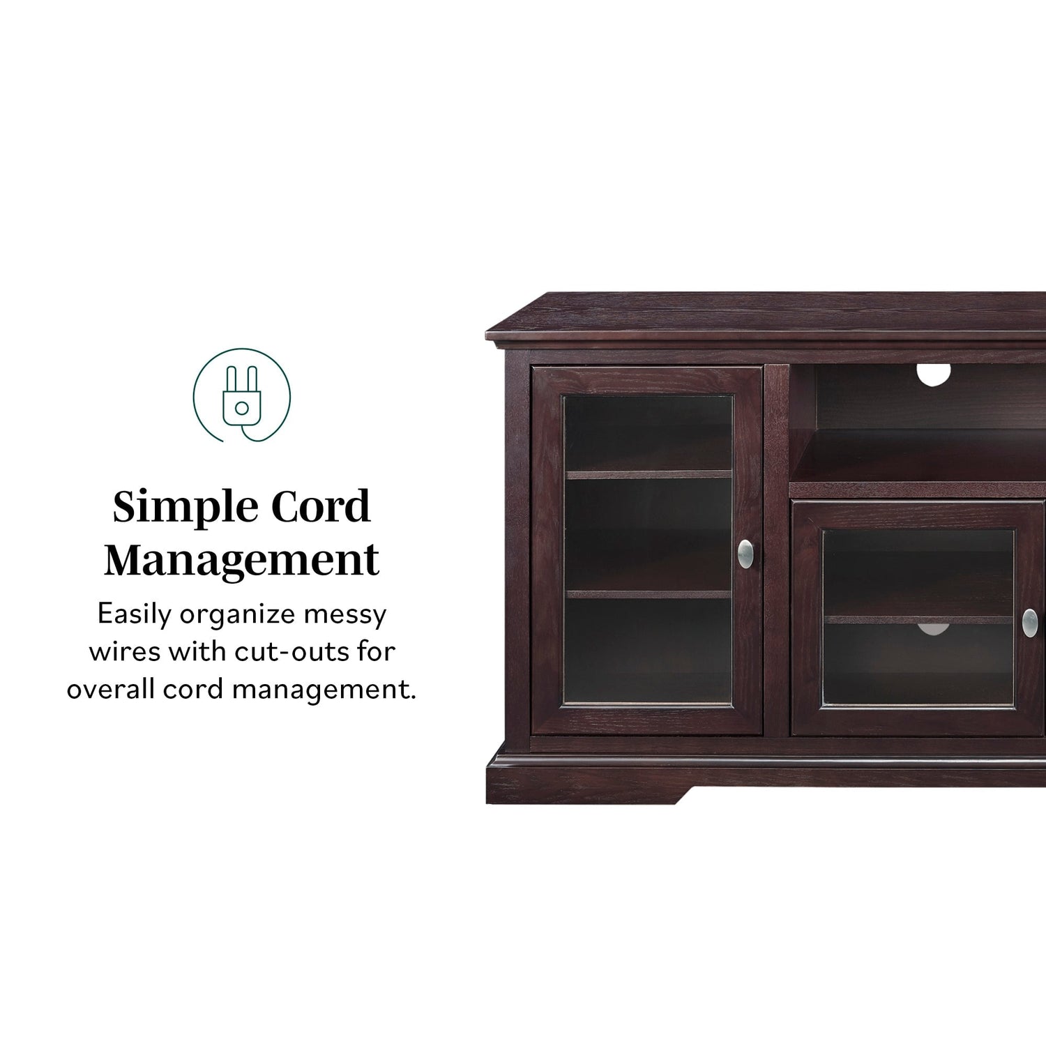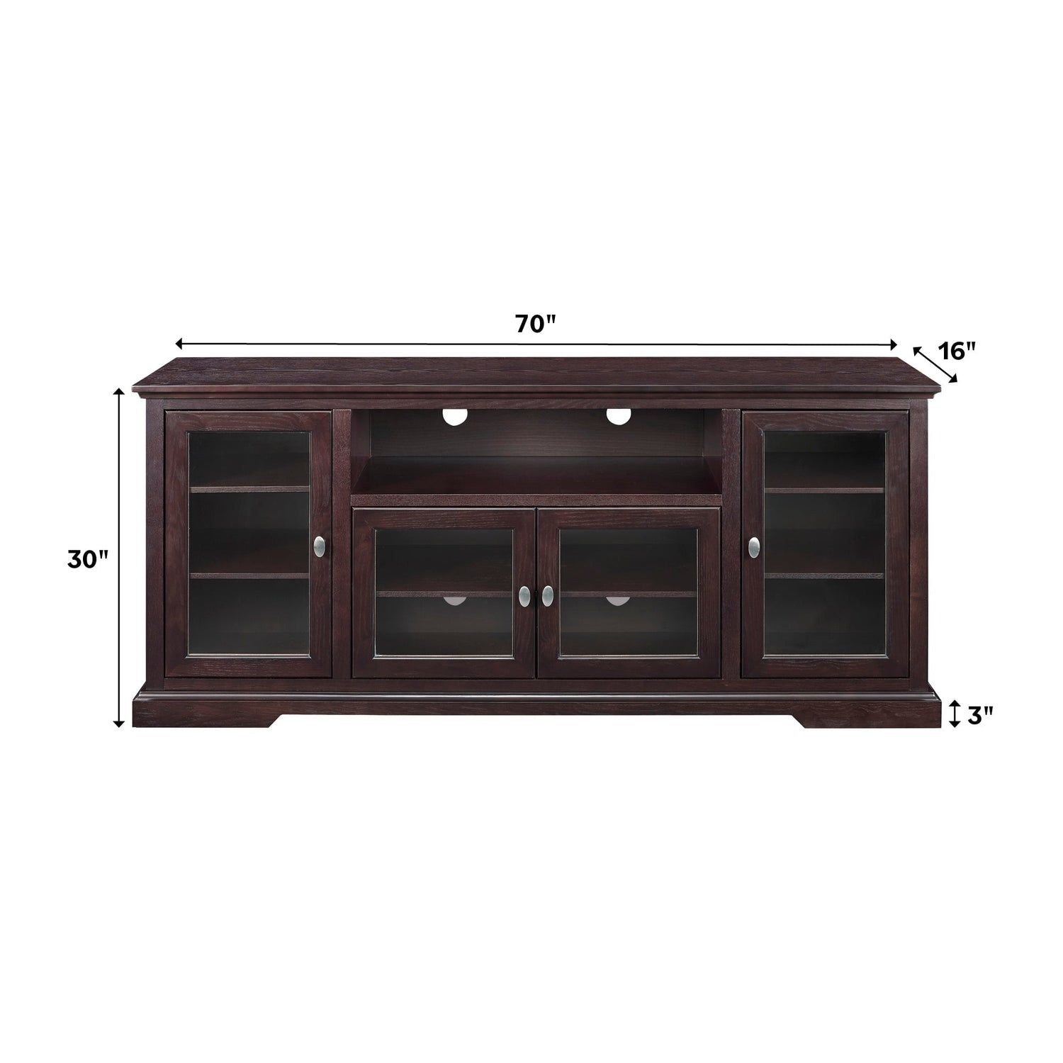 This 70" Highboy Style Wood TV Stand features a traditional silhouette crafted from warp-resistant MDF wood with a durable laminate finish, ensuring both longevity and timeless appeal. Its tall frame and four tempered glass doors provide ample display and storage space, while adjustable shelves allow for tailored organization of electronics, media, and décor. Designed to accommodate flat-panel TVs up to 80 inches, it also includes cord management ports to maintain a clean, streamlined setup.