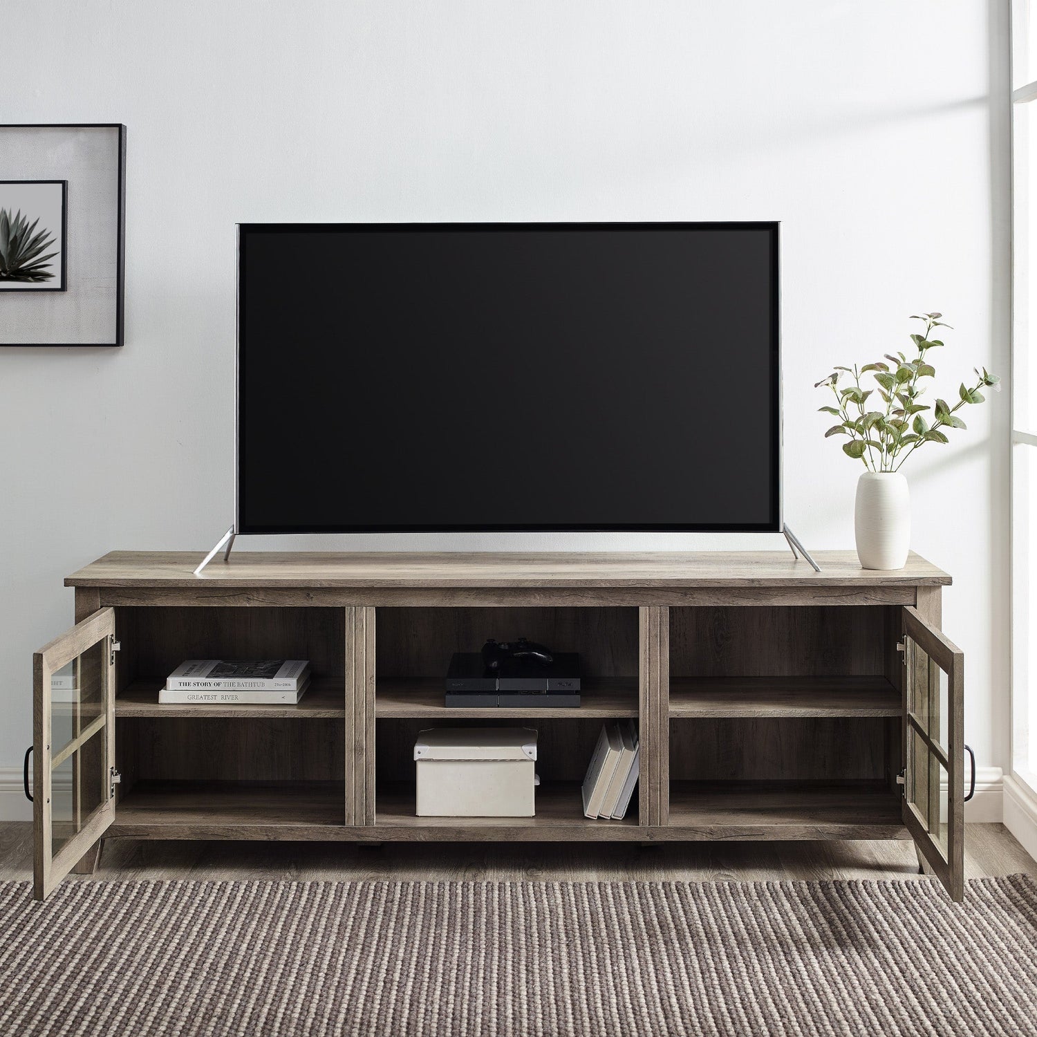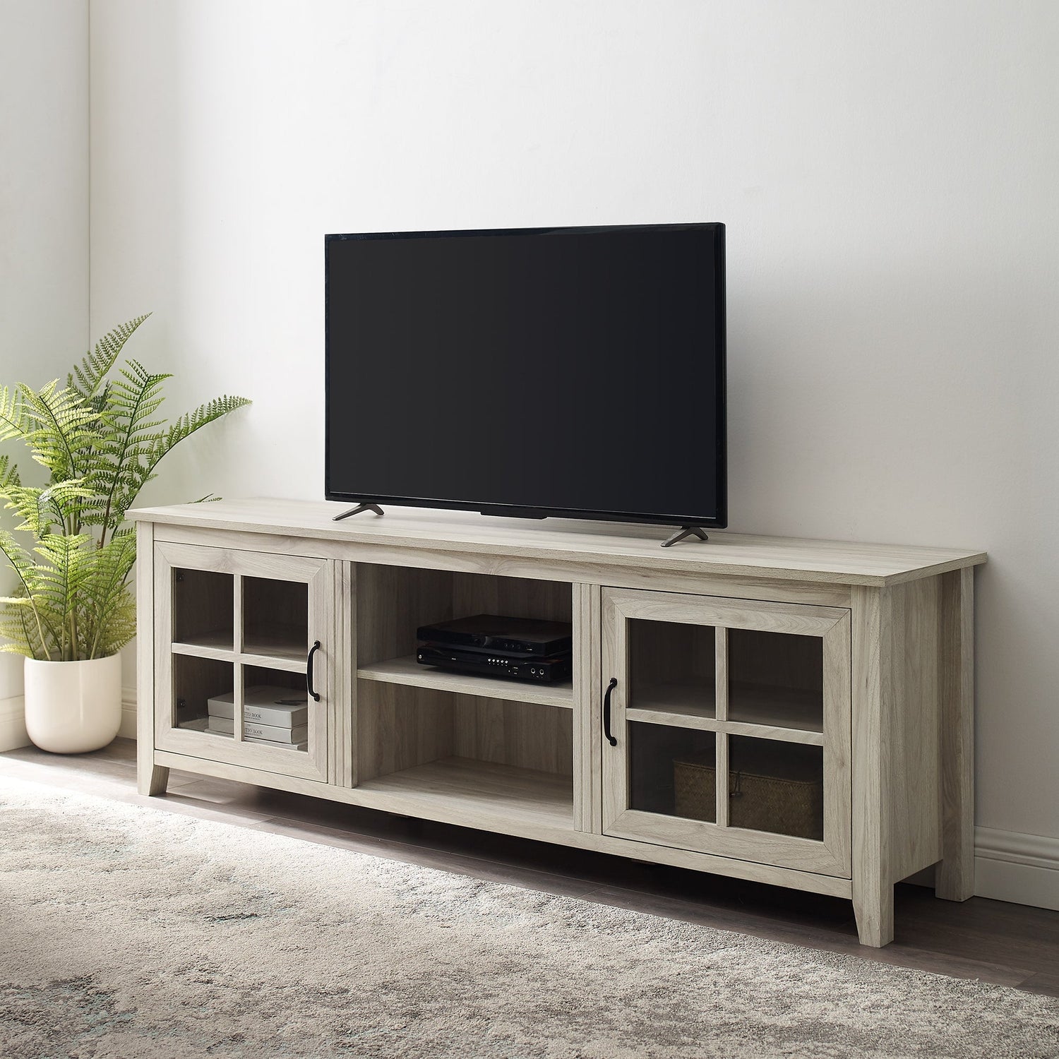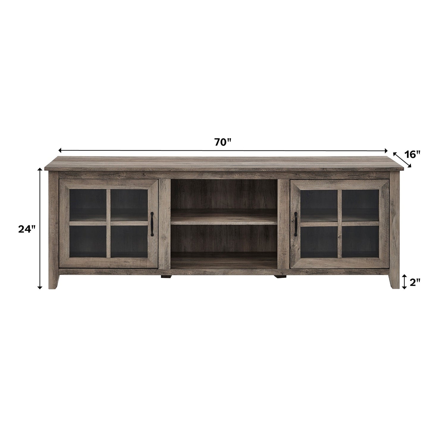 Crafted from solid wood with a natural finish, the Farmhouse 70" Simple Window Pane 2 Door Wood TV Stand combines rustic charm with practical design. Its clear tempered glass doors reveal three adjustable shelves, allowing tailored storage and display of your favorite items while maintaining a clean, open feel. The sturdy construction supports your entertainment essentials while adding an inviting farmhouse aesthetic to any living space.