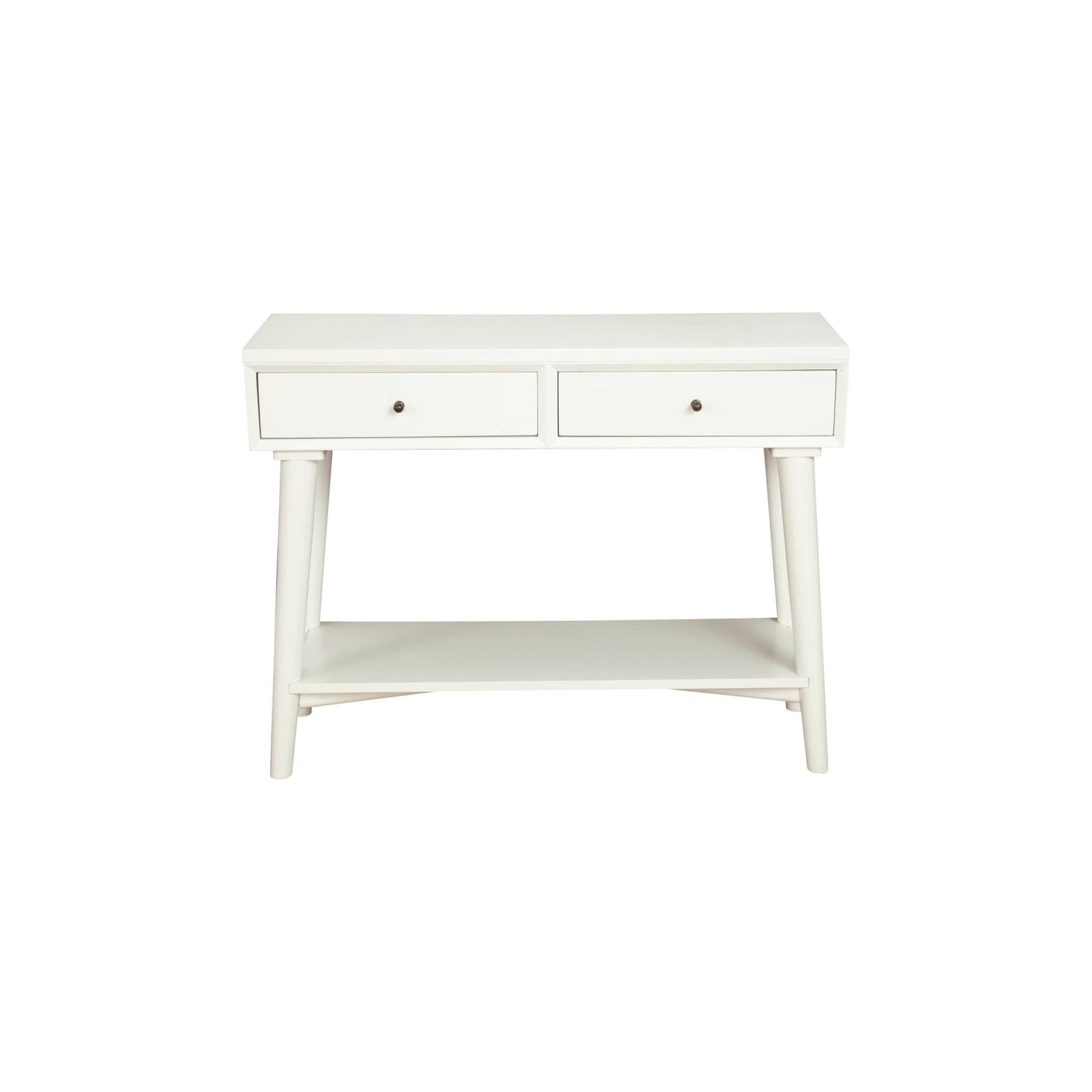 Streamlined and modern, the Flynn console table updates the aesthetic of your home. Mahogany wood solids and Okume veneer are finished in a beautiful white finish and blend effortlessly with your color scheme. This piece features flared legs, accent hardware, and 2 felt-lined drawers. Mix and match with other pieces from the Alpine Furniture Flynn collection.