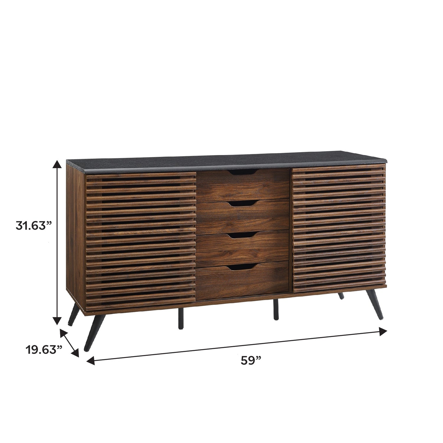 - Storage: Two sliding doors with adjustable shelves, four drawers