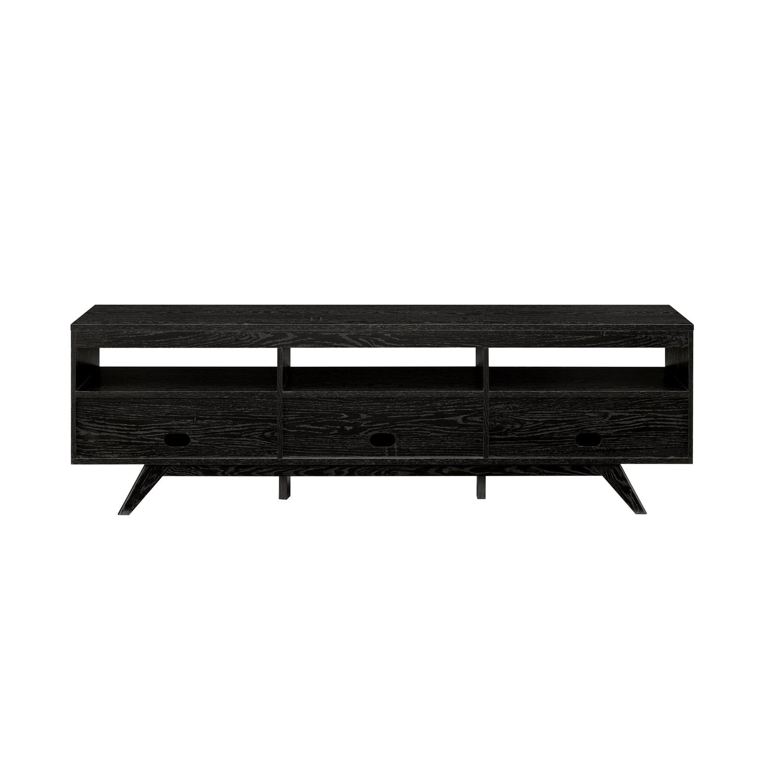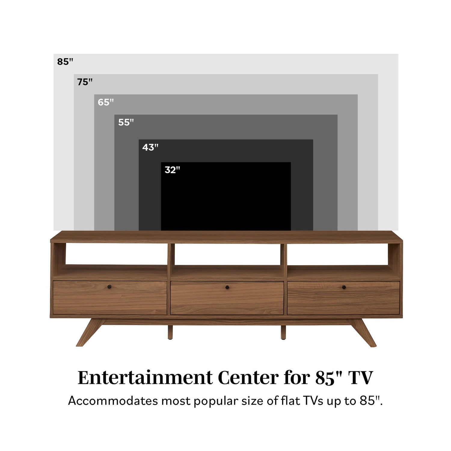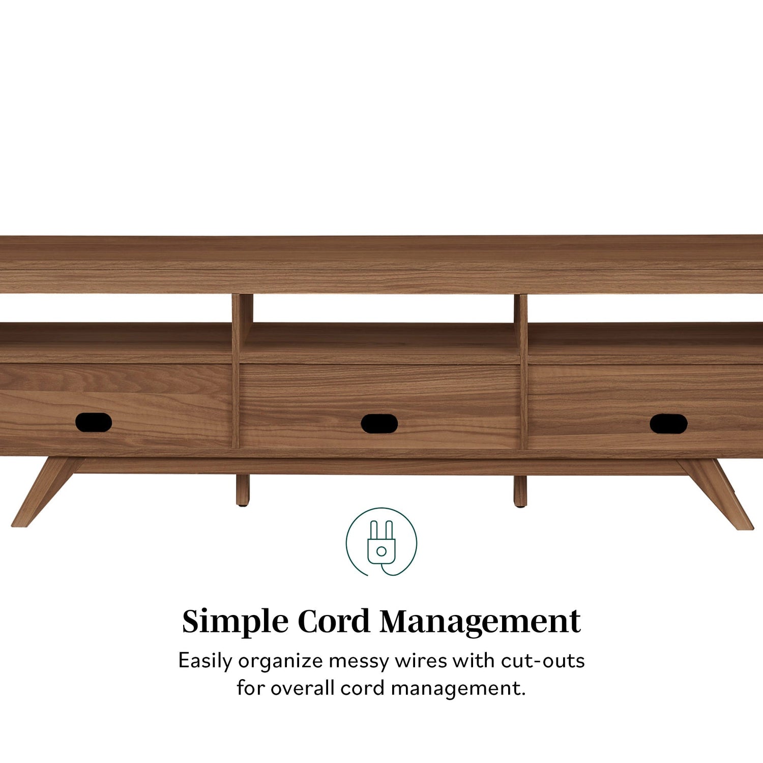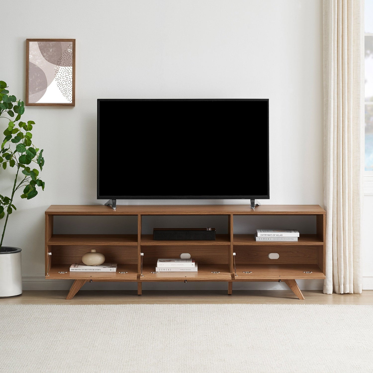 The Mid-Century Kela Modern 3-Door TV Stand combines sleek design with practical storage, crafted from high-quality engineered wood with a smooth veneer finish. Its minimalist silhouette is complemented by three open cubbies ideal for media devices and decorative items, while the three drop-down doors with faux drawer fronts conceal ample closed storage to keep clutter out of sight. This piece effortlessly supports up to an 80-inch flat-screen TV, adding a sophisticated, functional focal point to any living area.