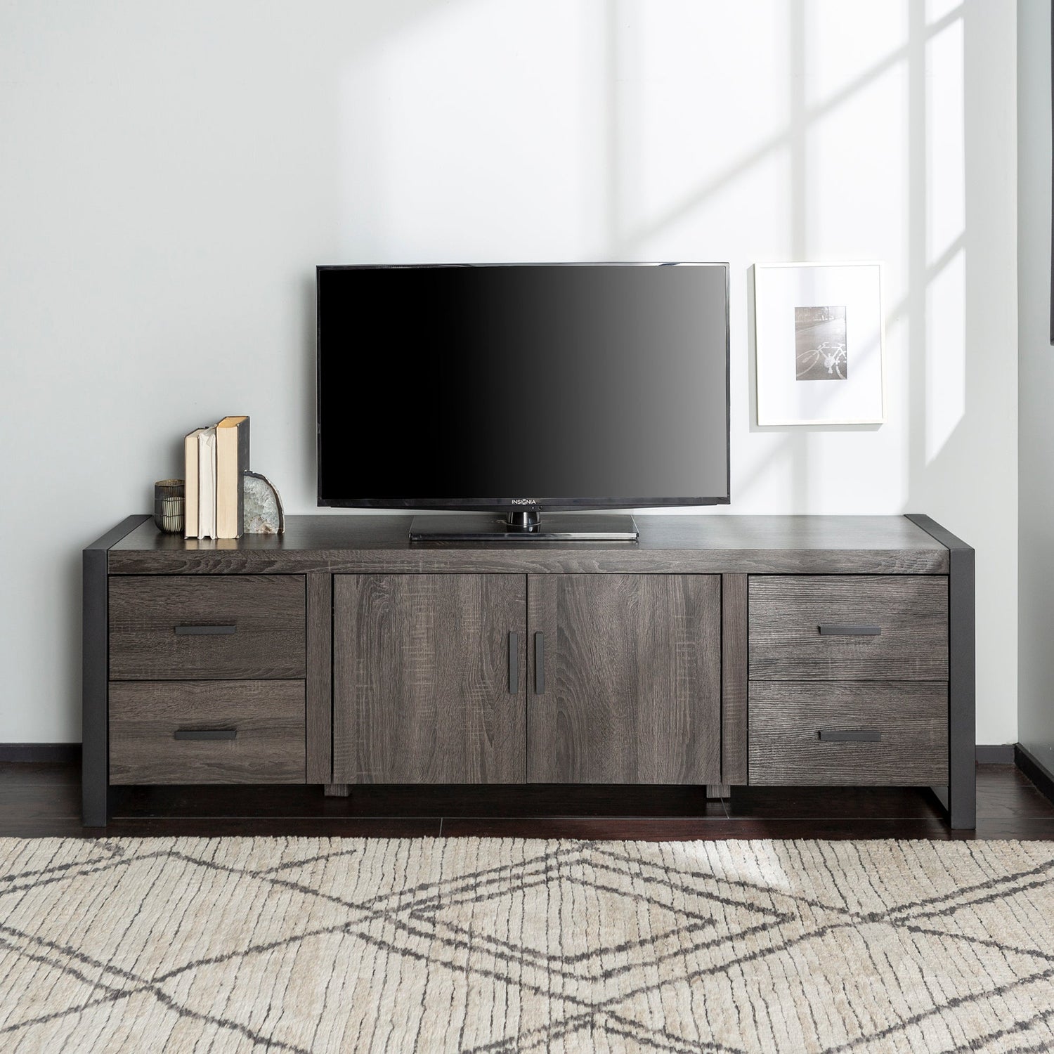 The Urban Blend TV Stand combines durable laminate construction with metal side legs and handles, delivering a sleek urban industrial aesthetic. Its design features four side drawers and a central cabinet, offering ample closed storage to neatly organize electronics and media while maintaining a clean, streamlined look in your living space.