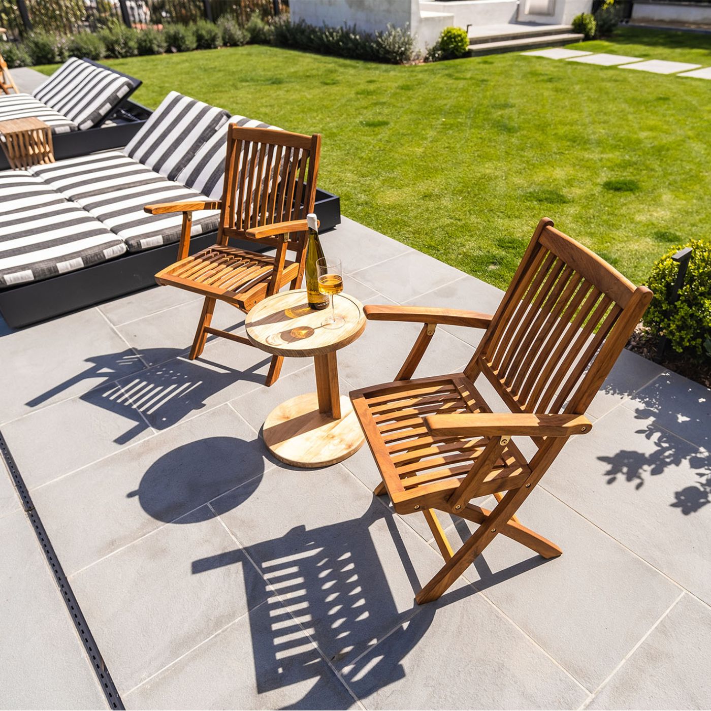 This C-shaped side table is crafted from 100% sustainably harvested solid teak wood. Designed for durability, it is suitable for both outdoor and indoor use and offers a balance of functionality and style.