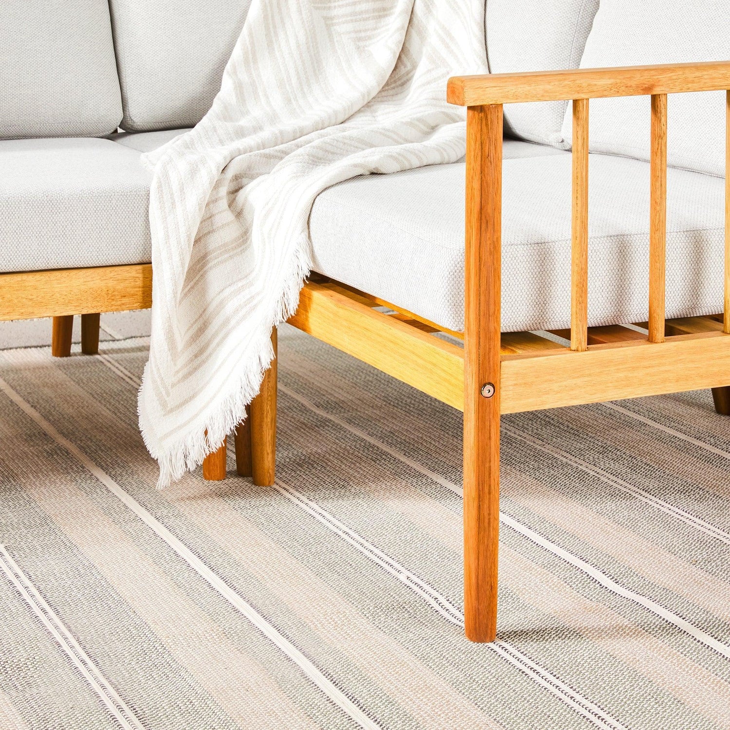 Crafted from responsibly sourced solid eucalyptus wood, this modern 5-piece L-shaped sectional set combines durable materials with clean, spindle detailing for a refined outdoor presence. The linen fabric cushions, measuring five inches thick, offer comfort while enhancing the set’s sophisticated silhouette, fitting seamlessly into varied patio layouts to create an inviting, functional seating area.