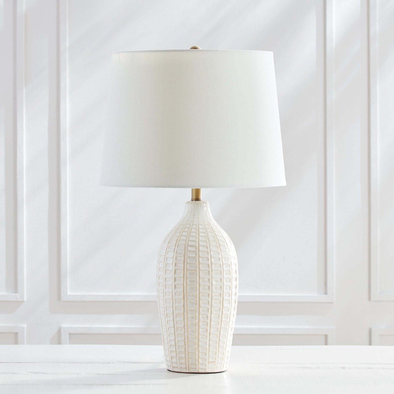 The body of the lamp is gently tapered, a silhouette often found in mid-century and transitional decor, but here it’s softened by the tactile texture reminiscent of woven linen or handcrafted tile. The off-white glaze is gently kissed with beige undertones, creating a warm, aged patina that mimics the look of sun-bleached ceramics long treasured on a farmhouse shelf. Topped with a classic white drum shade and a brushed brass finial, the overall composition is understated yet full of nostalgic charm.