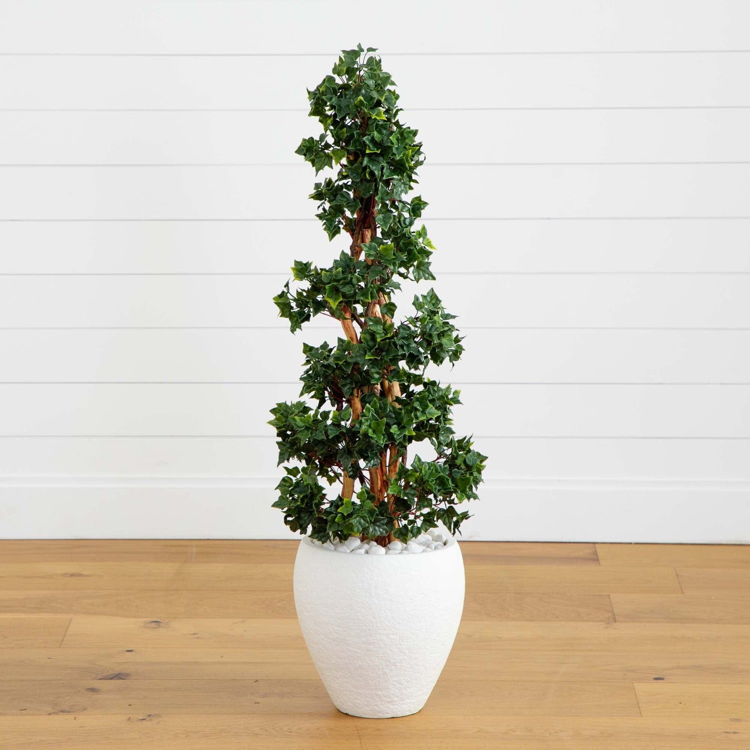 Enjoy the timeless beauty of a spiral cut faux English ivy topiary tree that looks like it took years to train and grow. You'll never believe it's not the real thing. A pair of these makes a grand statement in any entryway or conference room. Comes in a textured white oval planter with river rocks included so it will match with any decor.