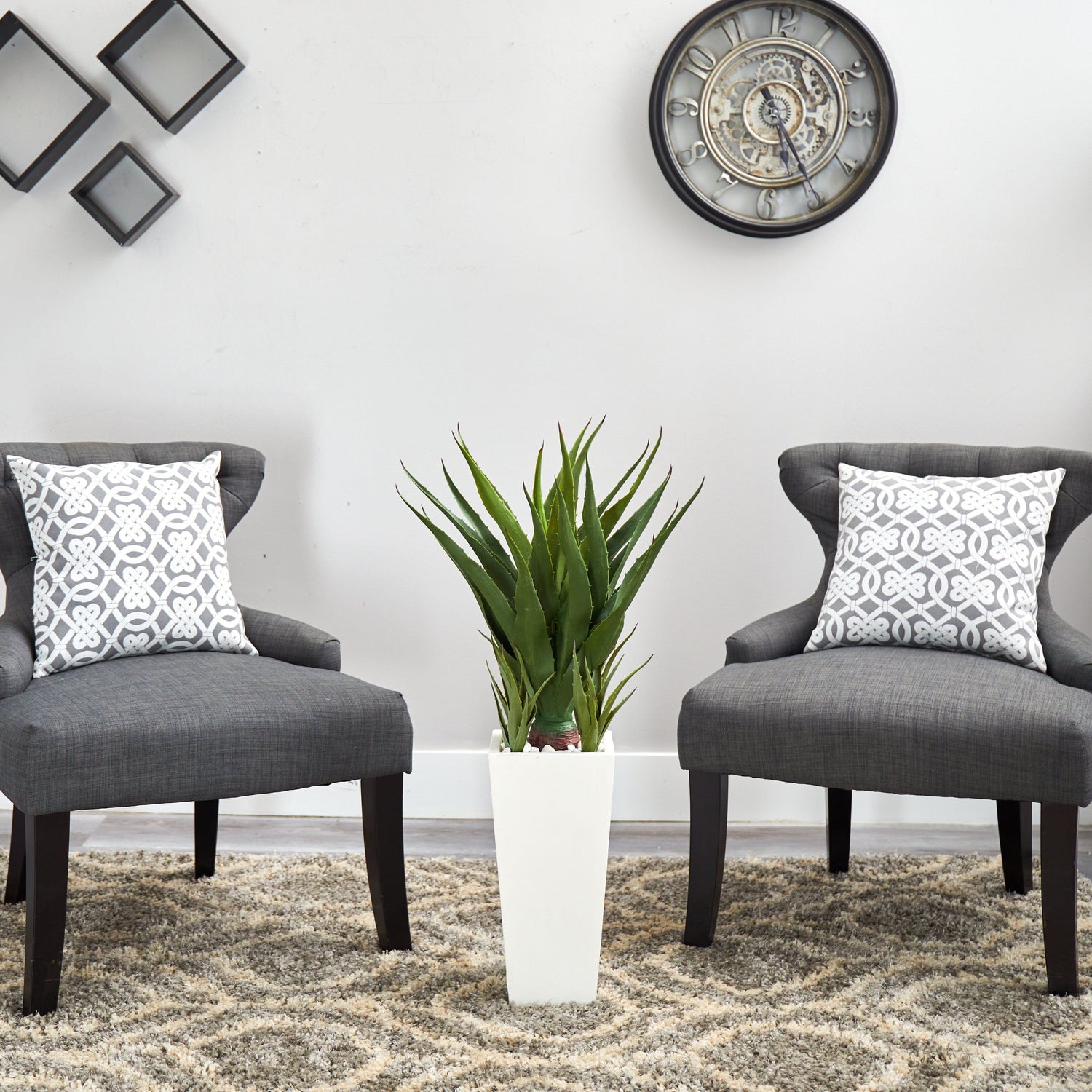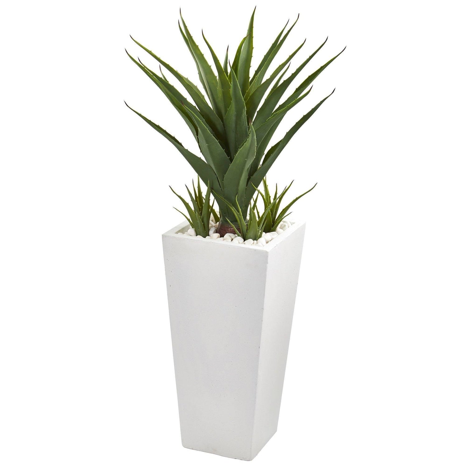 Make guests jealous with this eye-catching artificial agave plant. Reaching 40” high, this lifelike replica boasts spiky leaves that project outwards while smaller buds sprout from its base, all rich in coloring. Requiring absolutely no maintenance unlike its counterparts in nature, this realistic imitation is housed in a vertical white tower planter accented with natural tone rocks.
