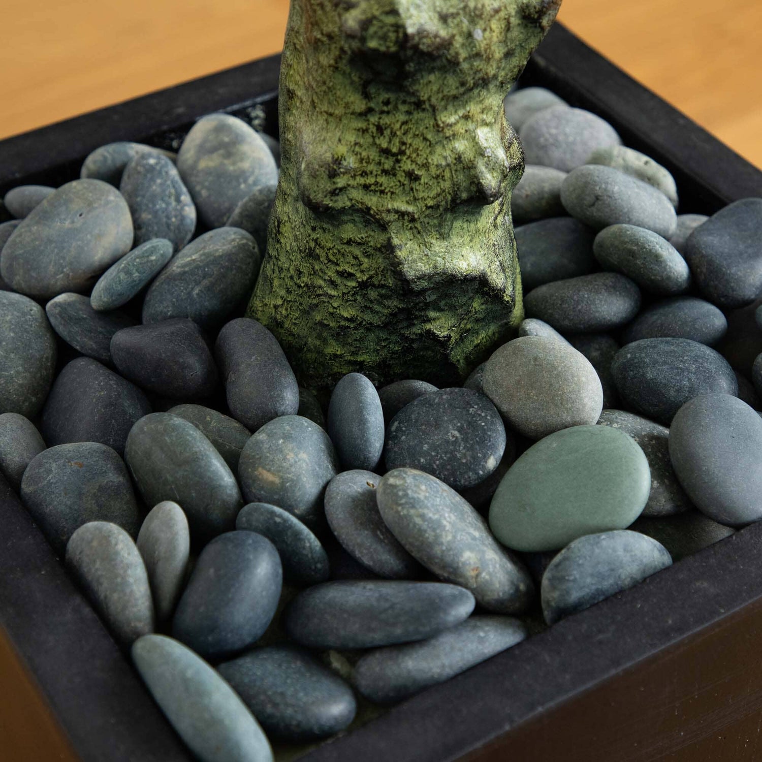 Realistic spears of lush green leaves fan out in two tiers over an intricate, well-crafted gnarled trunk. This lifelike mango artificial tree is created with care to look natural. With the included modern, minimalist black wash planter brimming with river rocks, it is a good fit for a contemporary office space. Place it near a large television monitor, digital dashboard, or other tech to add some life to a room. This piece is perfect for indoor or outdoor use.