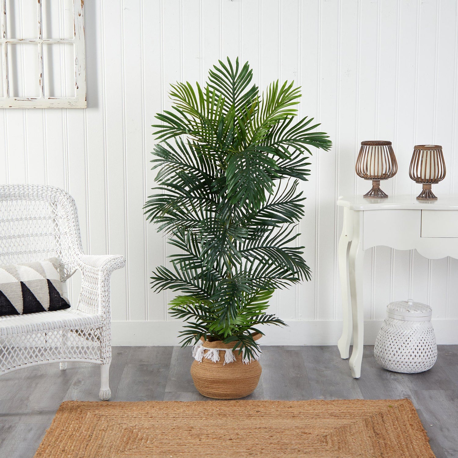Kick back, relax and stay on vacation mood year-round with this Areca Artificial Palm Tree. Variegated long palm fronds, arch in different directions bringing symmetry and depth to any room. Inspired by nature, add this faux palm tree outside and watch the fronds move with the wind just like the real ones. You can even bend them to fit in your space. Standing 5' from a boho chic planter (included in height), curate in any indoor/outdoor space. Great for a patio, next to outdoor furniture or in the foyer.