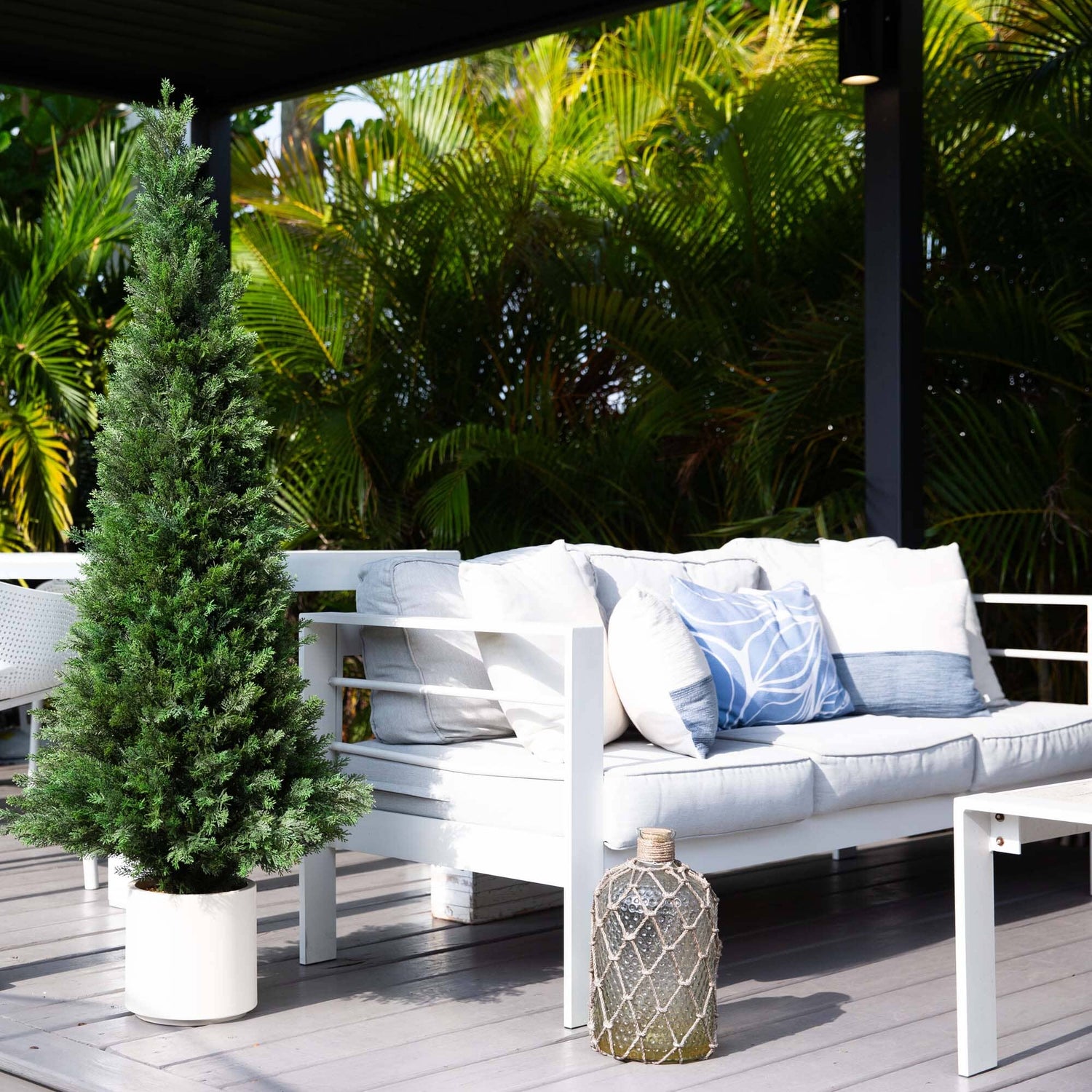 bring the best of the Pacific Northwest's dreamy forests with the artificial cedar tree. Inspired by the dreamy lush landscape, this cedar has lifelike leaves that look real. Crafted from high-quality materials, bend the branches to fit in your space for a custom look. Manufactured through a special, secret process, this piece is safe for outdoor use, display under a covered surface for longevity. Standing 5' from a white planter, you'll faux for this piece. Great for patios, porches, entryways and more. *Bring inside during inclement weather.