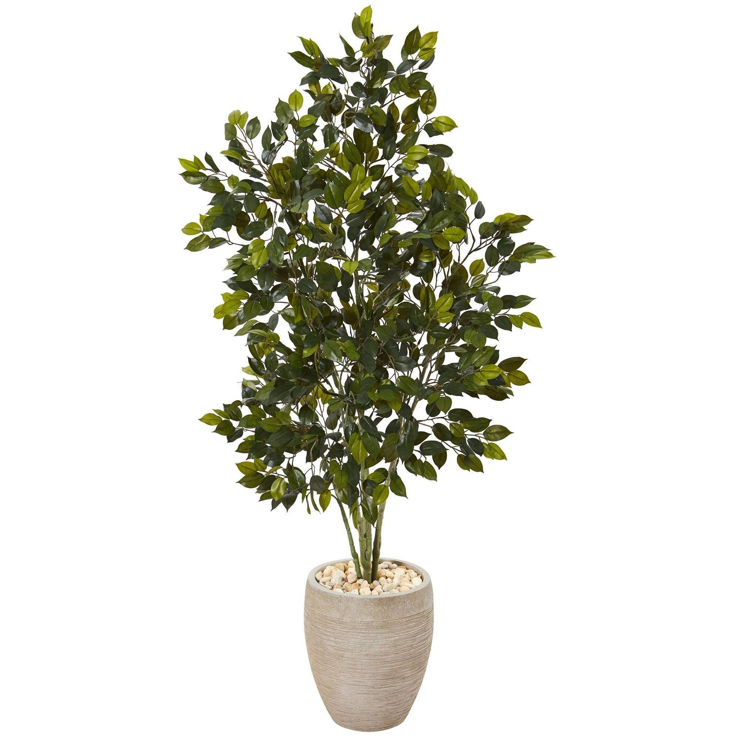 Exhibit a fresh, relaxing environment in your home or office with the help of this artificial tree boasting a rich overgrowth of bushy ficus foliage, handsomely designed with naturally occurring details and coloration. Standing 53” high from a sand colored planter, this fake tree would instantly revitalize any space it inhabits.