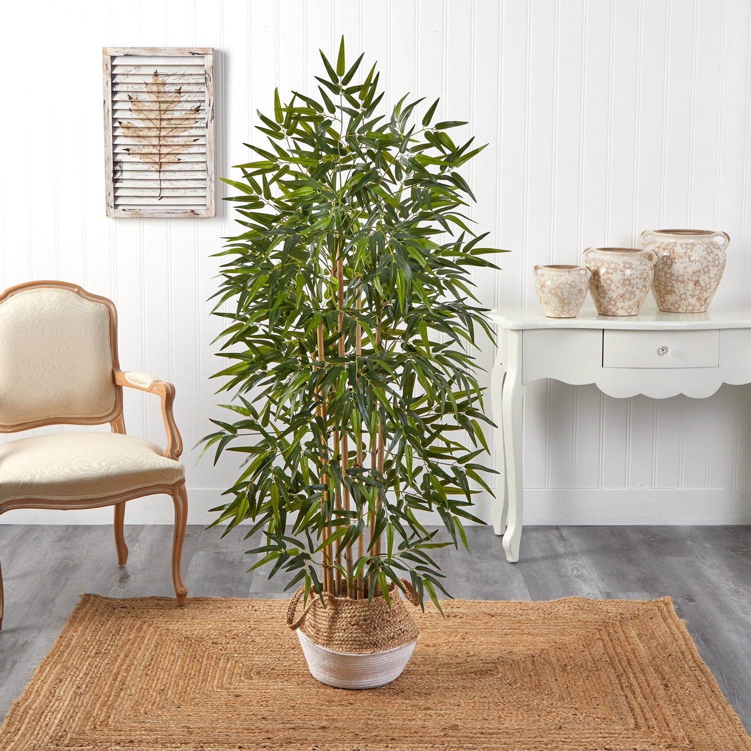 64” Bamboo Tree with Natural Bamboo Trunks in Boho Chic Handmade Cotton & Jute White Woven Planter