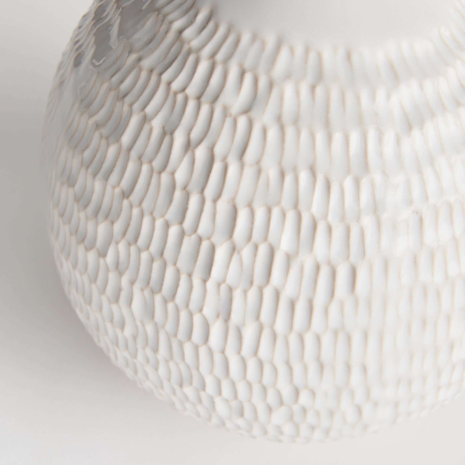 The artisan vintage-style white ceramic accent vase is a quiet celebration of handcrafted beauty and timeless form. With its gently rounded shape and intricate, etched texture reminiscent of hand-chiseled stone or woven fabric, this vase speaks to the heart of traditional pottery. Each subtle indentation tells a story—of steady hands, aged tools, and the kind of artistry passed down through generations.