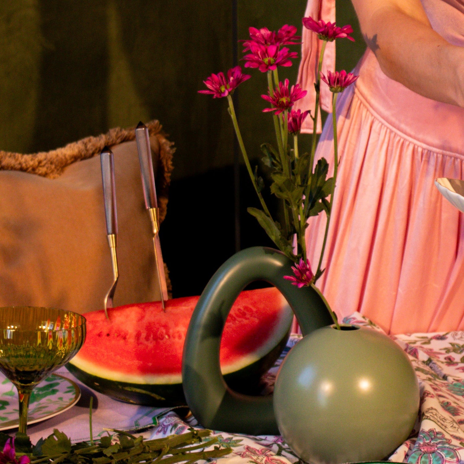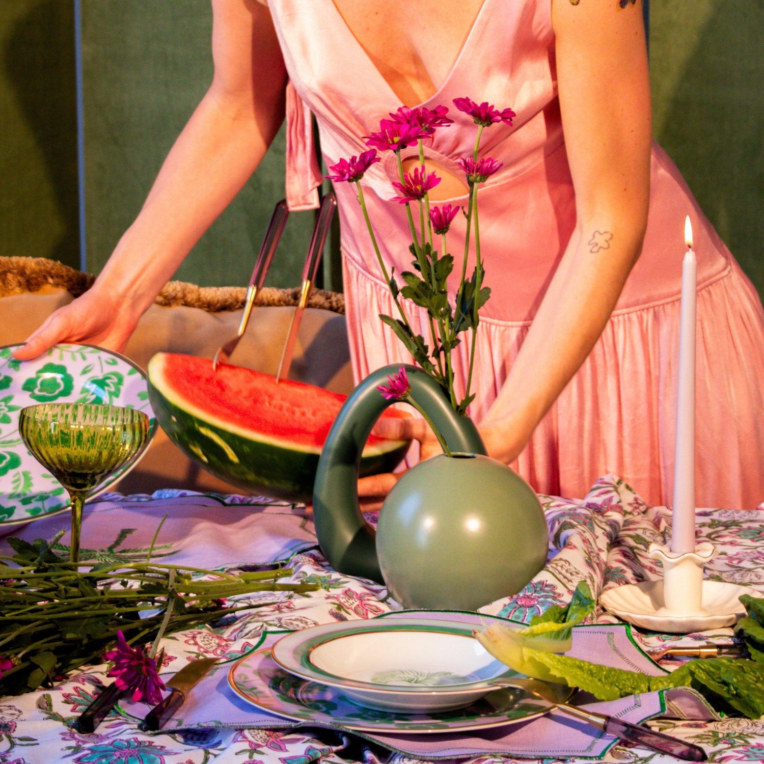 Meticulously sculpted from a matte ceramic, its verdant green hue in a silhouette that pays homage to sleek and organic forms, embodying the allure of shaded lounges. Pair with other Vintage Palm collection pieces.