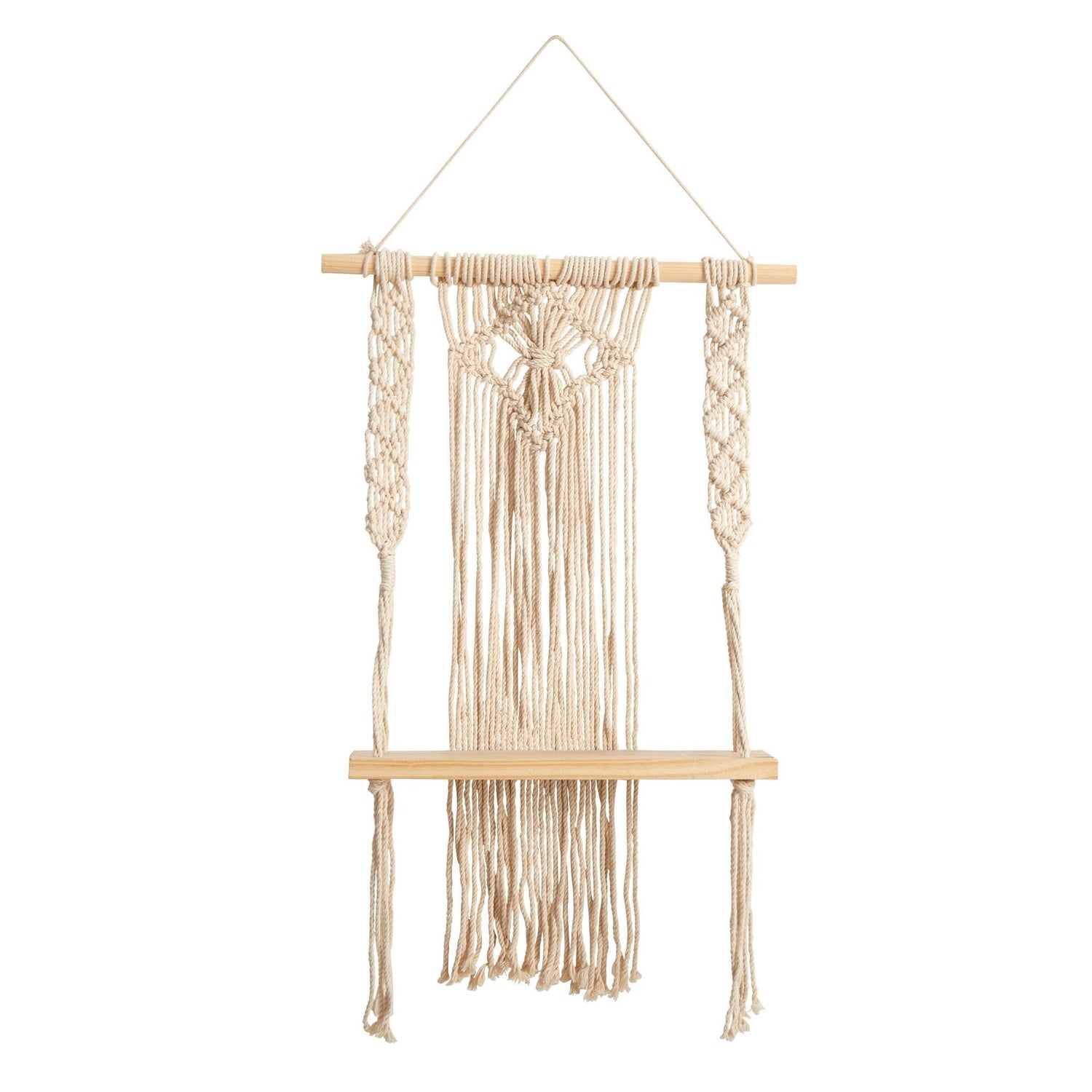 Make your boho dreams come true with this Handmade Macramé Wall Hanging Décor. Handcrafted from fine materials by artisans, the whimsical design contrasts with the rustic, wooden accent it hangs from. As an added bonus, you can use the shelf as extra storage space and display your faux plant. With dimensions of 24" X 16", easily hang on any bare wall. Enhance your style decor today by adding it above your bed.