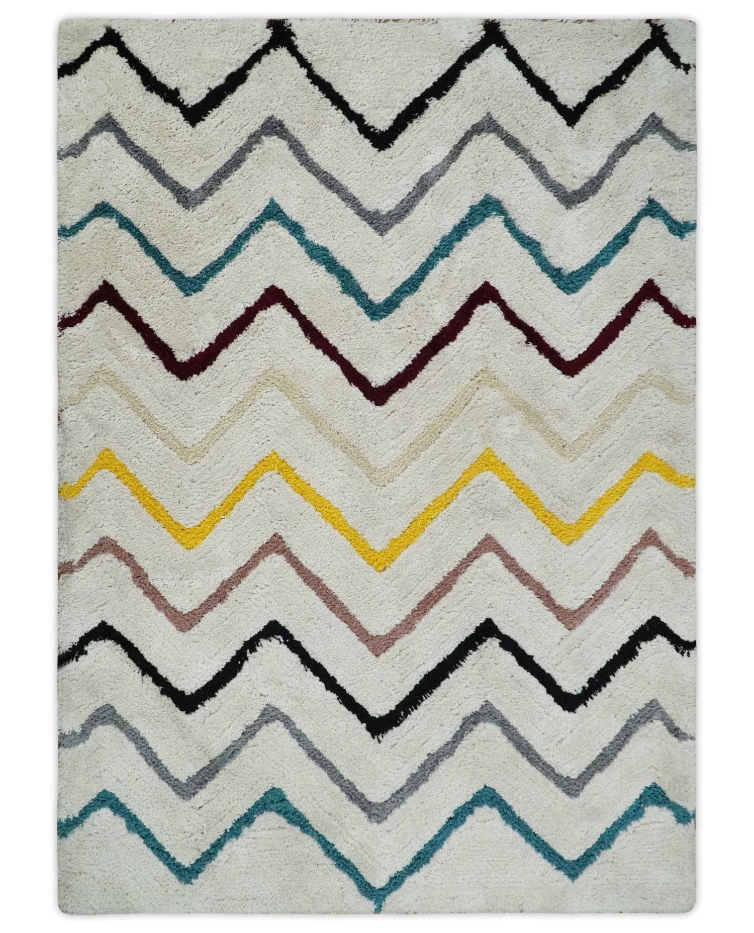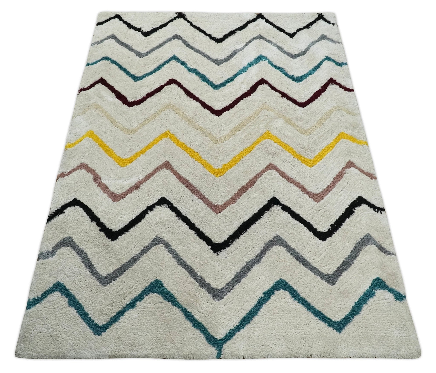 Our handmade 3x5, 4x6 and 5x7 area rug, woven with a soft and luxurious visocse, is an ideal choice for your flooring needs. Its shag ivory design with multicolor stripes is enhanced by a premium art silk construction, making it a beautiful and eye-catching addition to any space.
