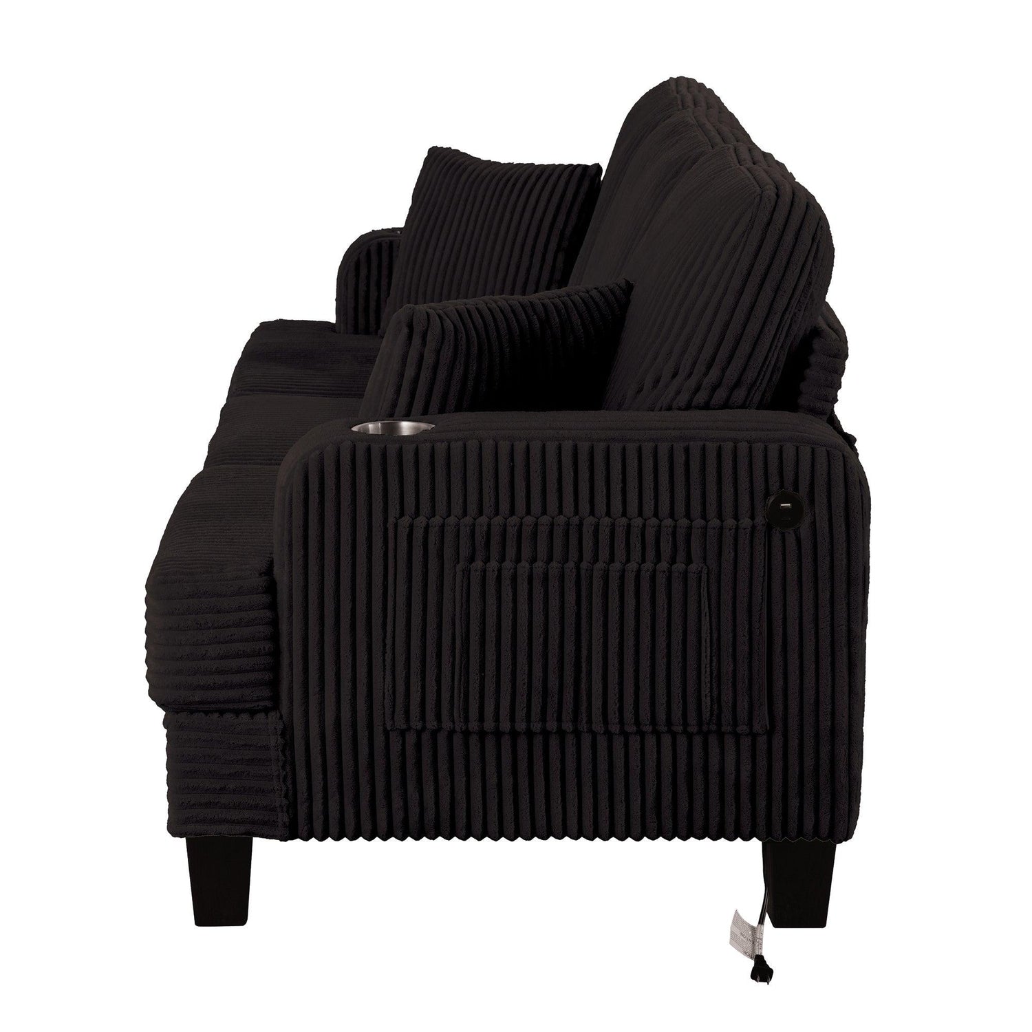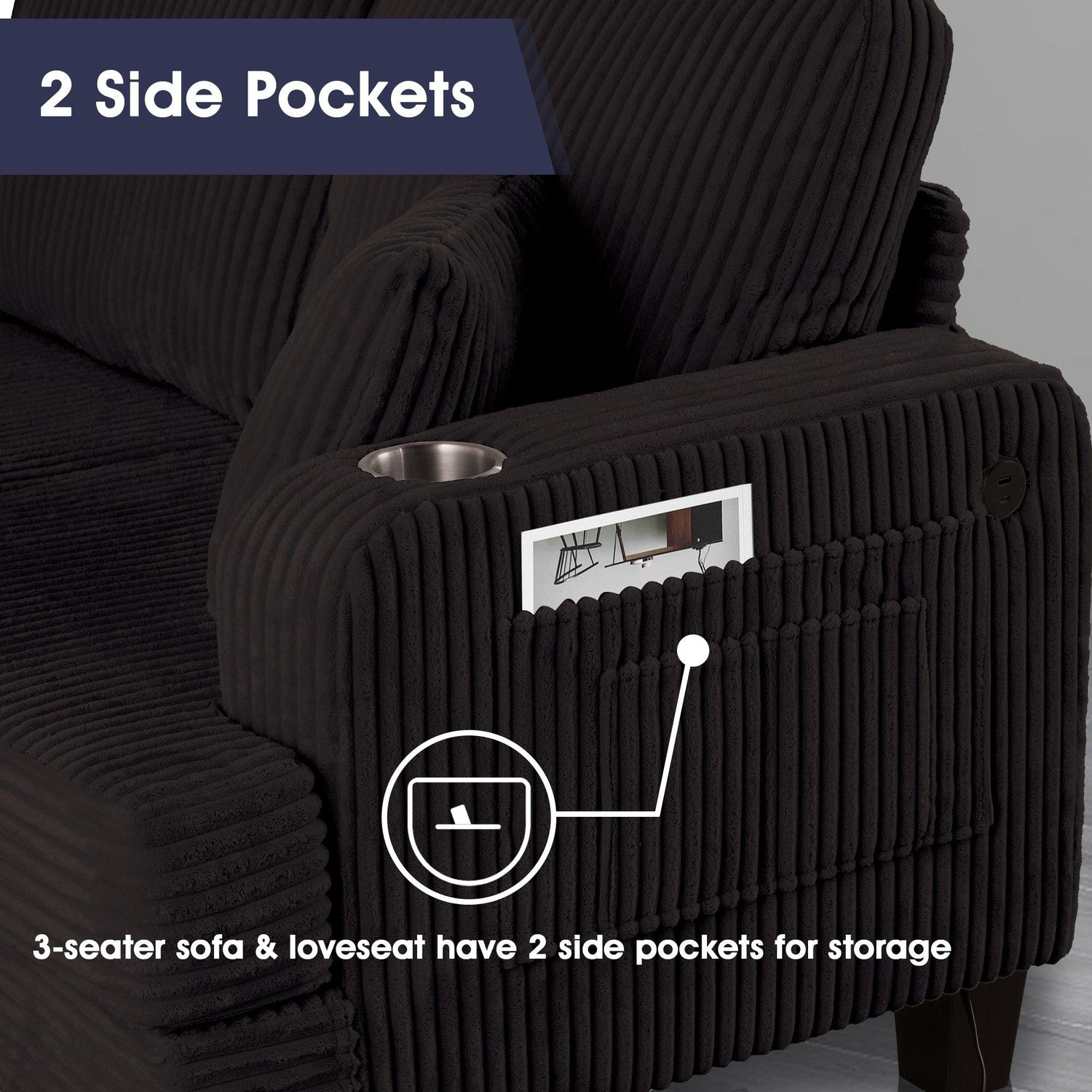 Black 3 Piece Set Comfy Sofa Couch 3-Seater & Loveseat Sofa with Storage Ottoman for Living Room with USB, Side Pockets, Pillows included