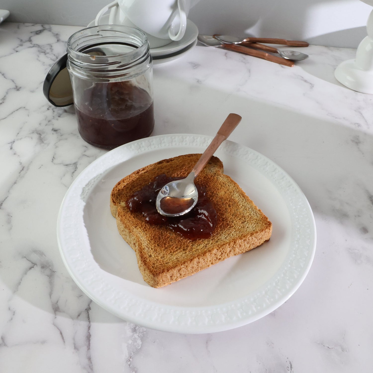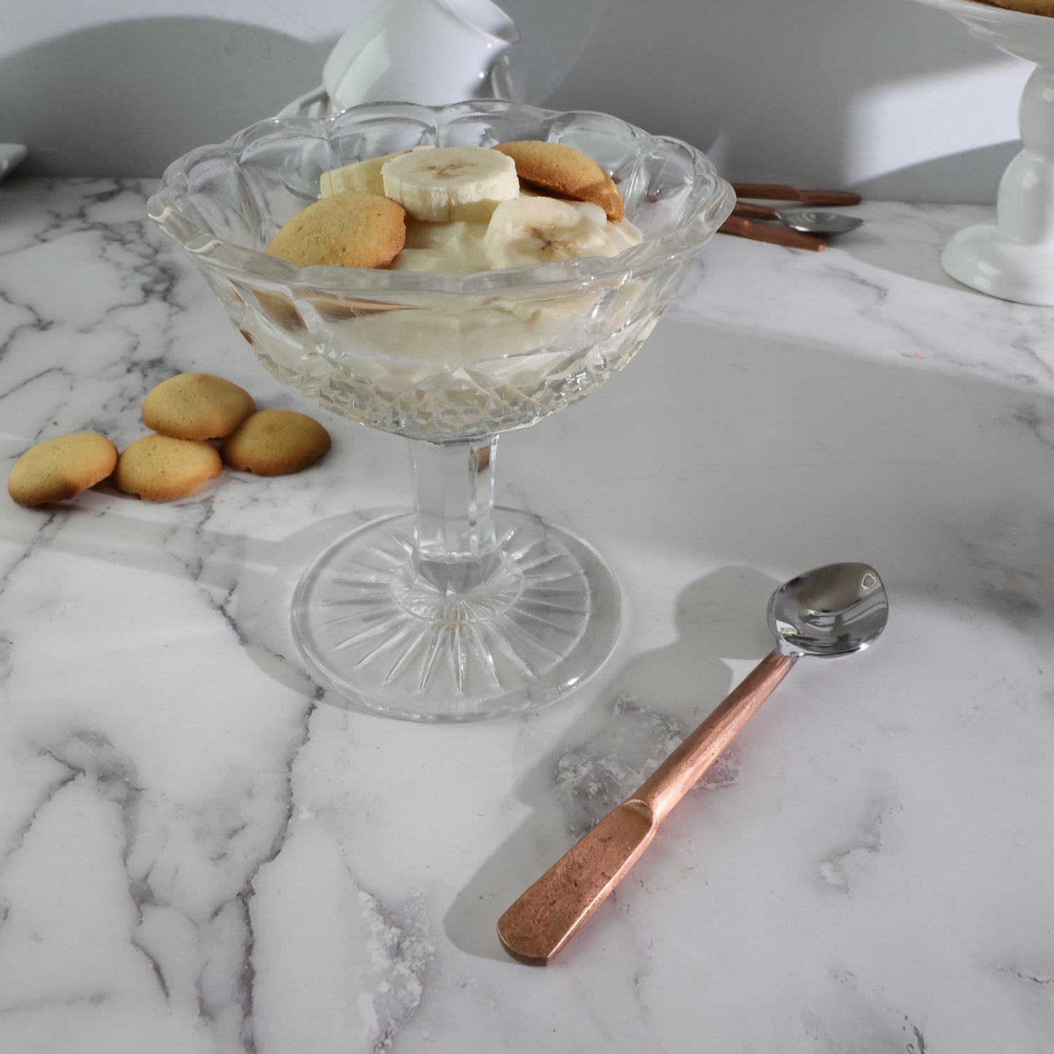 Give your coffee bar a fresh look with the Celia Coffee/Demitasse Spoon 4 Pc. Set. Textured handles in an antique copper finish offset these mirror-polished stainless steel spoons. Smaller demitasse spoons are perfect for specialty cups and for spooning cappuccino froth.
