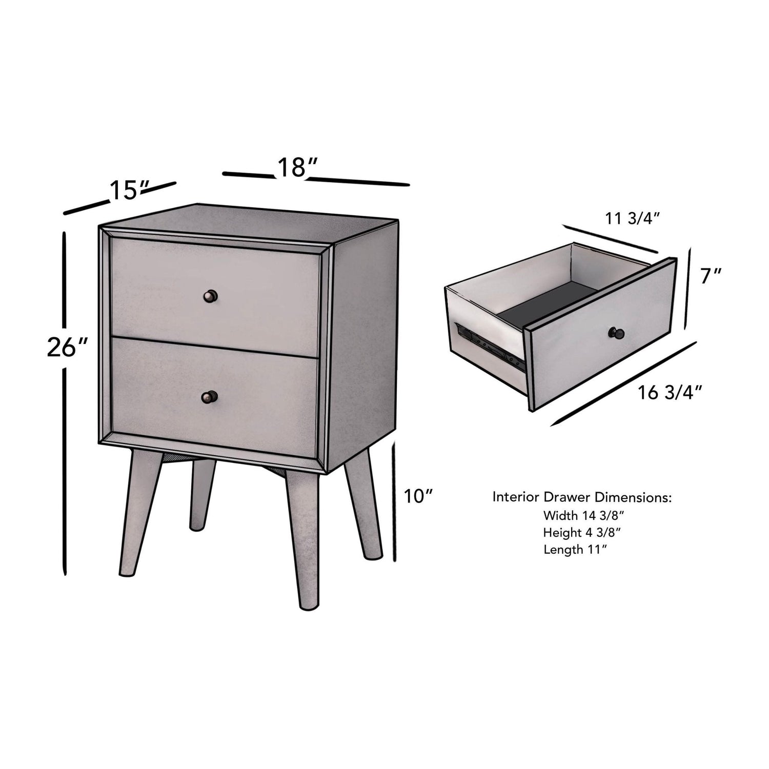 The Flynn collection features the classic lines of Mid-Century Modern furniture that never goes out of style. Its sturdy frames are built to last, constructed of sustainably sourced solid Mahogany to ensure a lifetime of use. The Flynn nightstand has two drawers to accommodate most bedside necessities. The nightstand comes fully assembled, and is constructed with ball bearing metal drawer glides and French & English dovetail drawer construction. The Flynn bedroom makes it easy to create a cohesive decorating style or mix and match for a more personalized look. Coordinates with other pieces in multiple finish options as part of the Alpine Furniture Flynn collection sold separately.