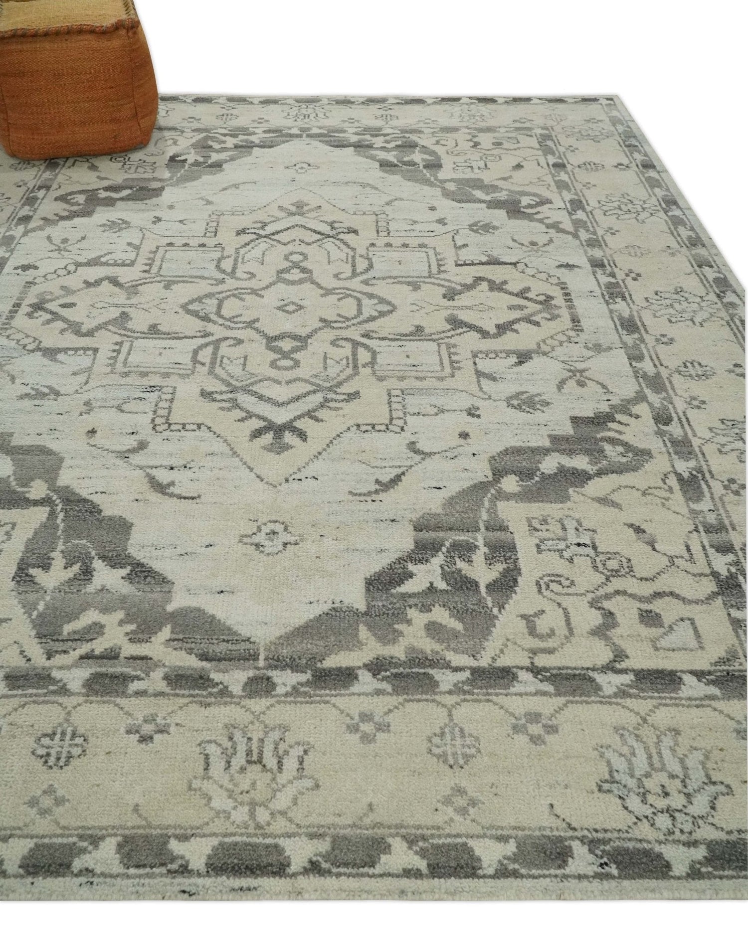 Hand Knotted Earthy Neutral Serapi Wool Rug, Charcoal, Beige and Ivory