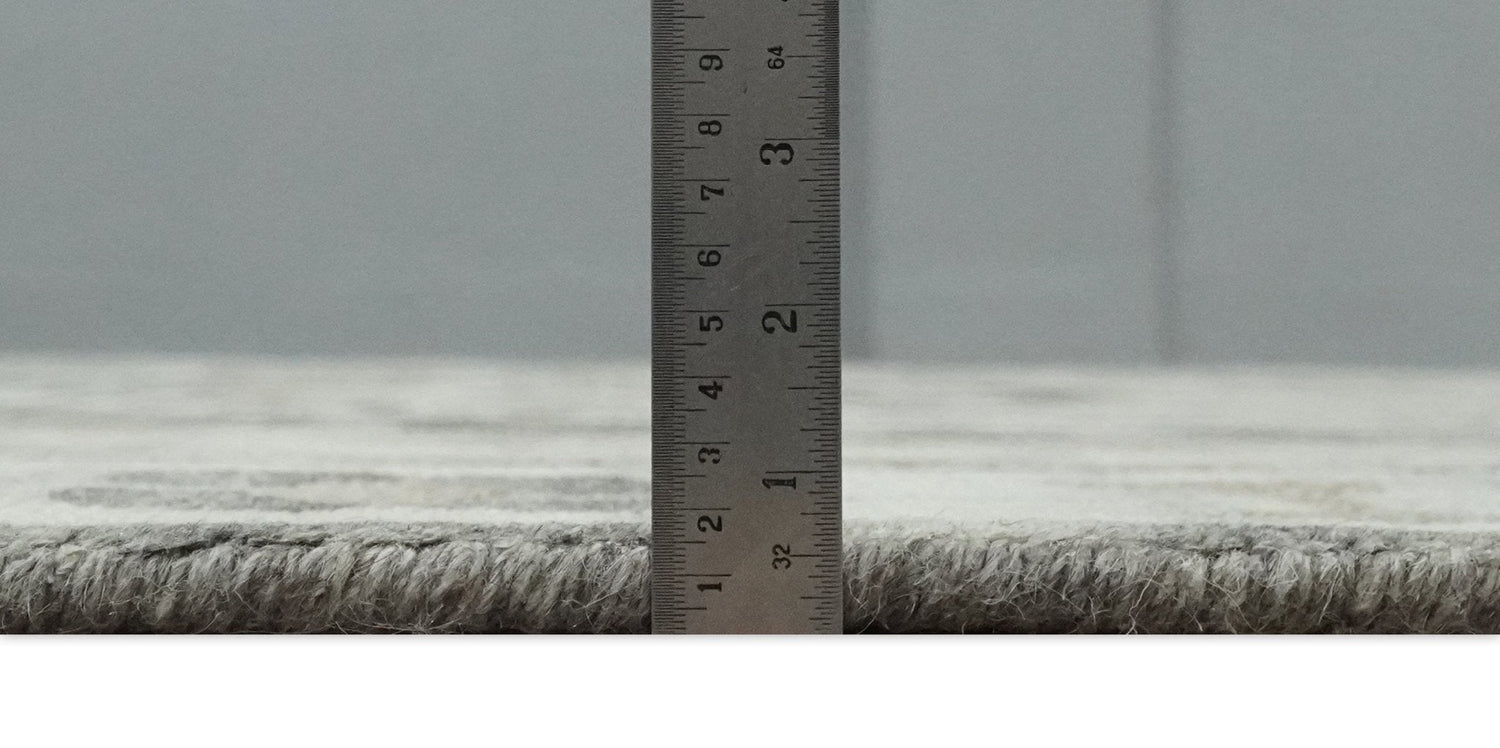 This hand-knotted rug is crafted with handspun wool and features traditional design elements in ivory, charcoal, and beige. The rug is made in Bhadohi, India, a city known for its centuries-old tradition of carpet weaving.