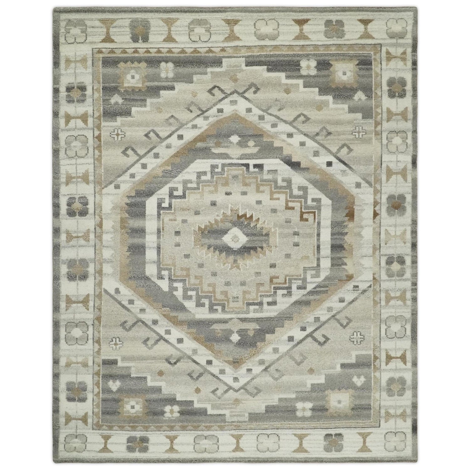 Hand Knotted Ivory, Charcoal and Beige Traditional Medallion Natural Wool Custom Made Area Rug, Kids, Living Room and Bedroom Rug