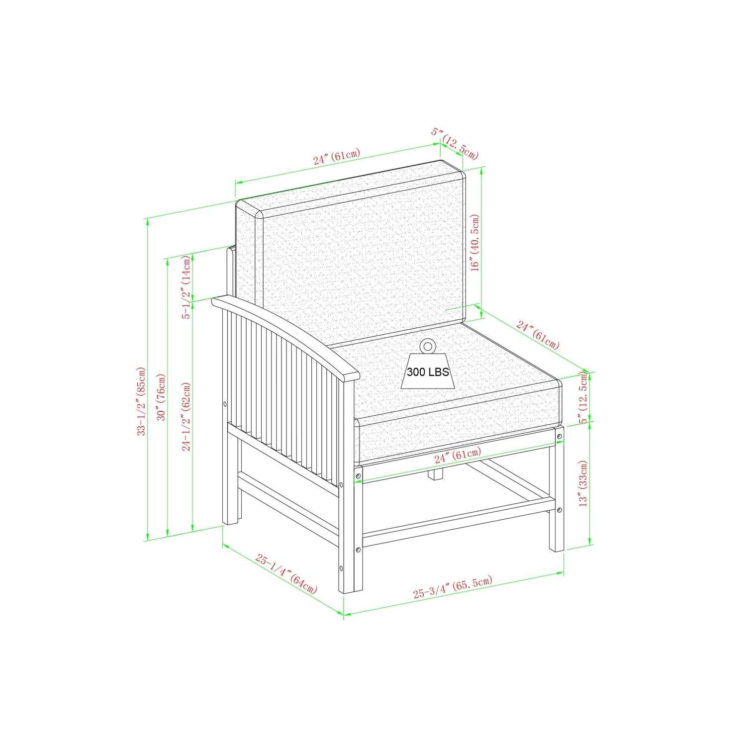 - Armless chair: 24" L x 25.25" W x 33.5" H (61 x 64 x 85 cm); 25 lbs