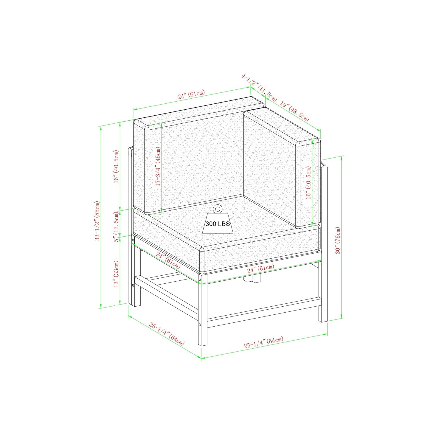 - Corner chair: 24" L x 25.25" W x 33.5" H (61 x 64 x 85 cm); 30 lbs