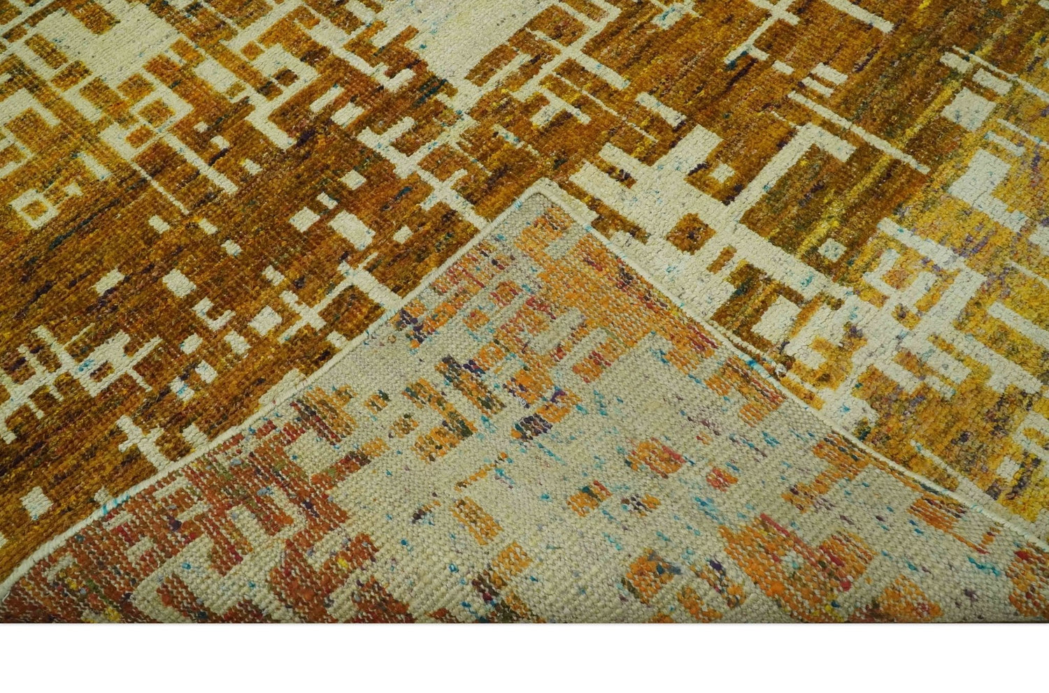 Modern Abstract 8x10 Gold, Rust and Ivory Hand Knotted Recycled Art Silk Rug