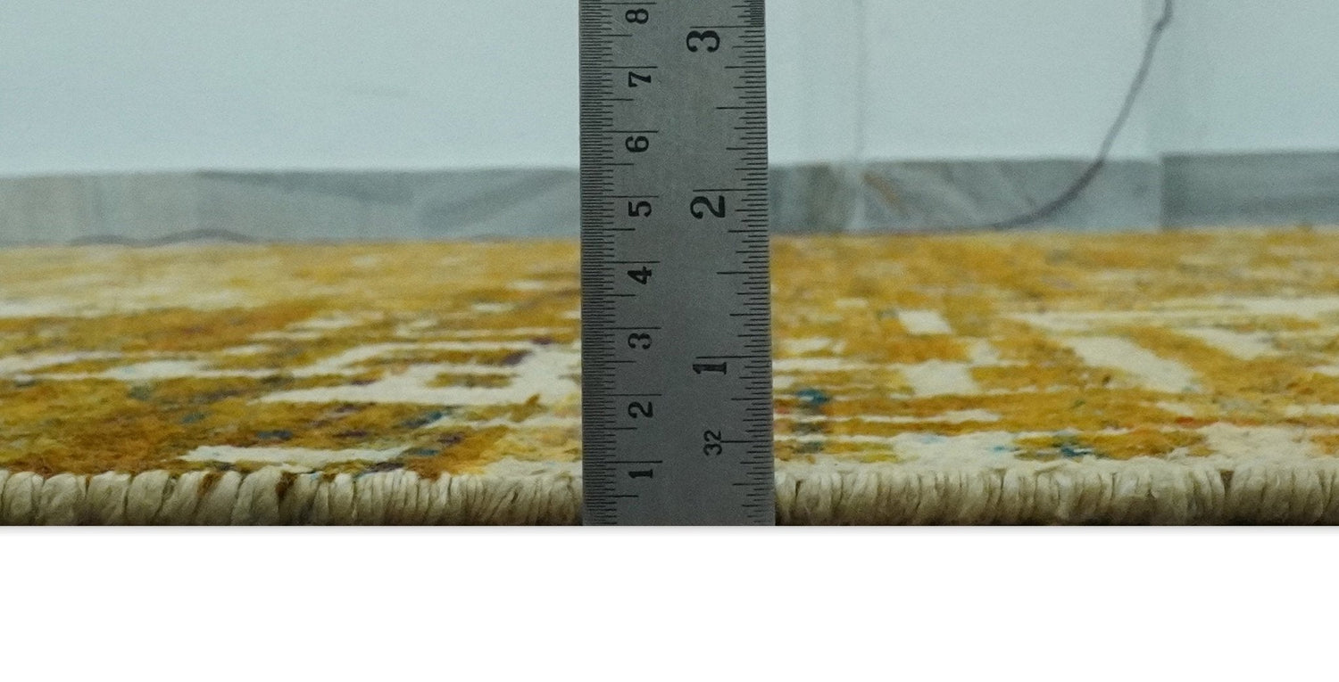 Expertly handcrafted using recycled art silk, this 8x10 modern abstract rug features a striking combination of gold, rust, and ivory tones. The hand knotting technique ensures durability and adds a unique texture to your decor. Elevate your space with this eco-friendly and stylish statement piece.